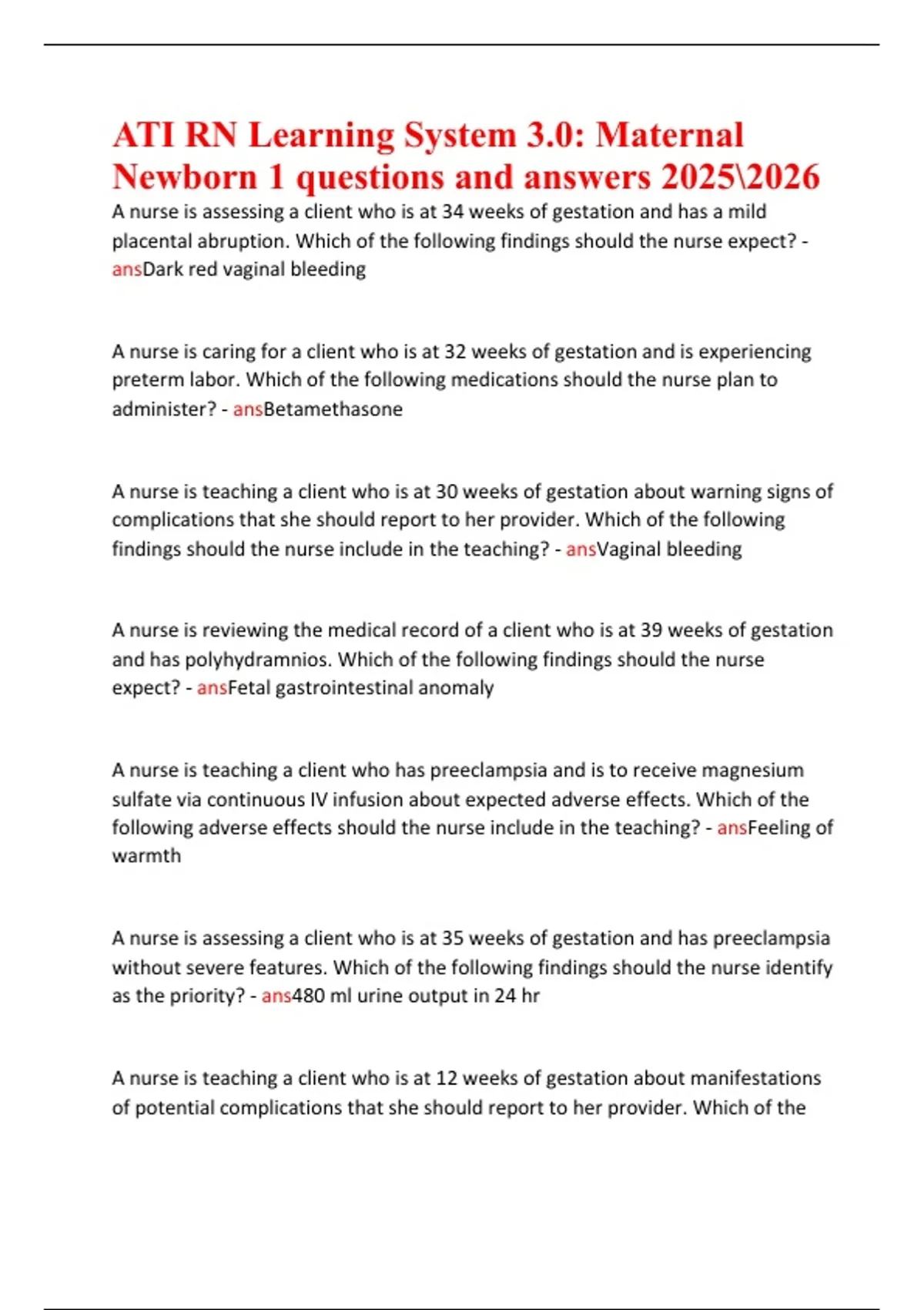 ATI RN Learning System 3.0 Maternal Newborn Practice Questions & Answers 2025/2026