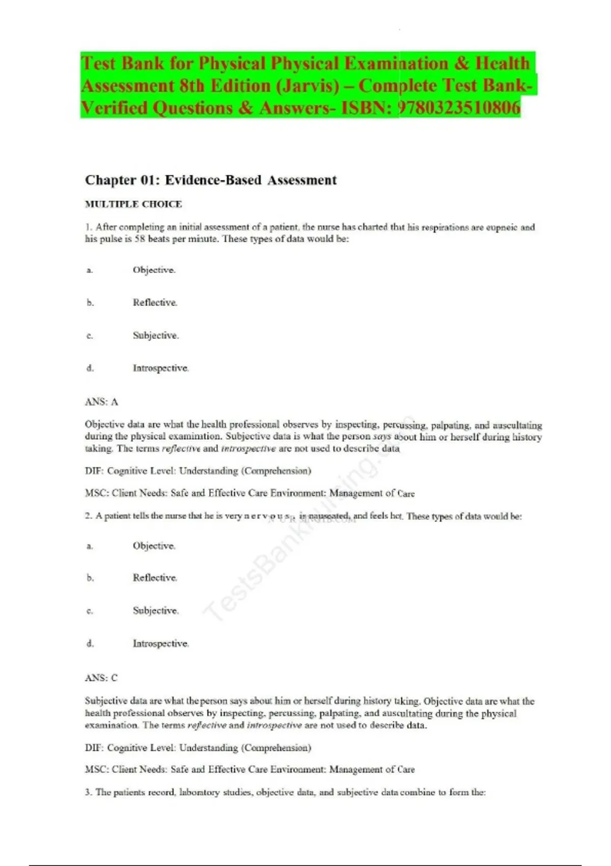 TEST BANK for Leadership Theory, Application, & Skill Development 6th Edition by Robert Lussier and Christopher Achua All Chapters 1-12Ace your exams with this complete and verified Test Bank for Physical Examination and Health Assessment, 8th Edition by Carolyn Jarvis. This resource includes all chapters, multiple-choice questions, correct answers, and detailed rationales, making it the perfect study tool for nursing students. This test bank helps you master key concepts such as: Evidence-based assessment Objective vs. subjective data Priority setting & clinical reasoning Nursing process & diagnostic reasoning Holistic and culturally sensitive assessment Focused, follow-up, comprehensive, and emergency assessments Designed specifically for nursing students in RN, LPN, BSN, and health assessment courses, this test bank strengthens your critical thinking, boosts exam performance, and supports clearer understanding of essential assessment principles. Use this resource to: – Prepare for quizzes, midterms, and finals – Practice NCLEX-style questions – Study smarter and more efficiently – Improve confidence in physical assessment coursework This is a complete, high-quality, easy-to-use test bank—perfect for anyone using Jarvis 8e.