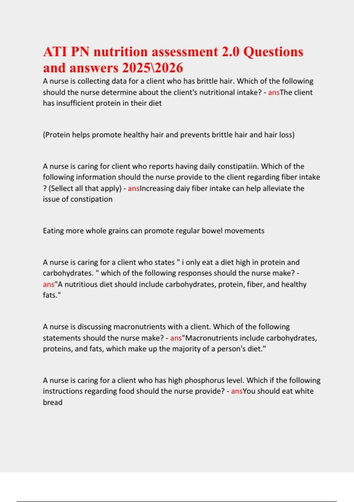 ATI PN Nutrition Assessment 2.0 Practice Questions & Answers 2025/2026