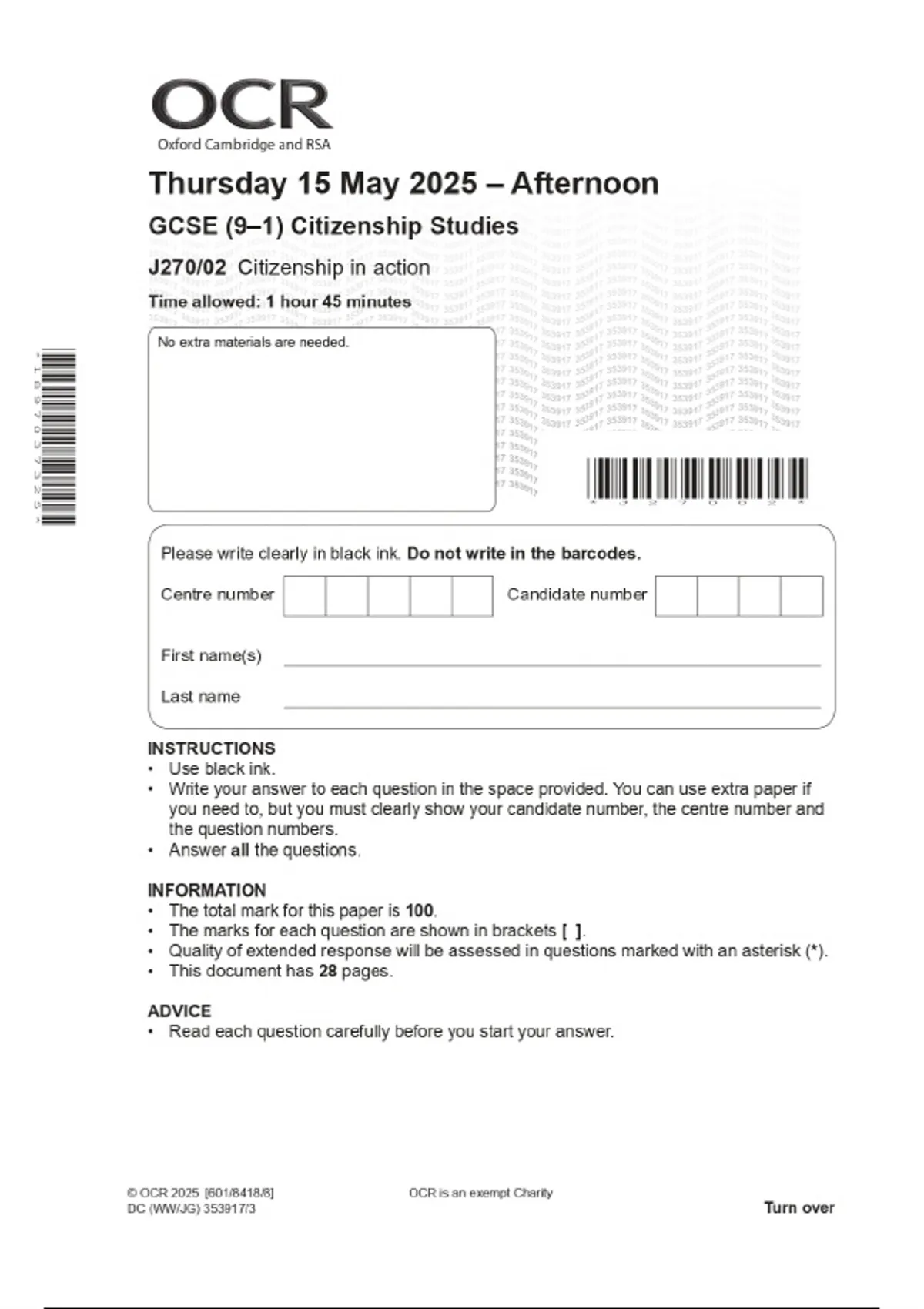 2025 OCR GCSE (9–1) Citizenship Studies J270/02 Citizenship in action Combined Question Paper & Final Marking Scheme