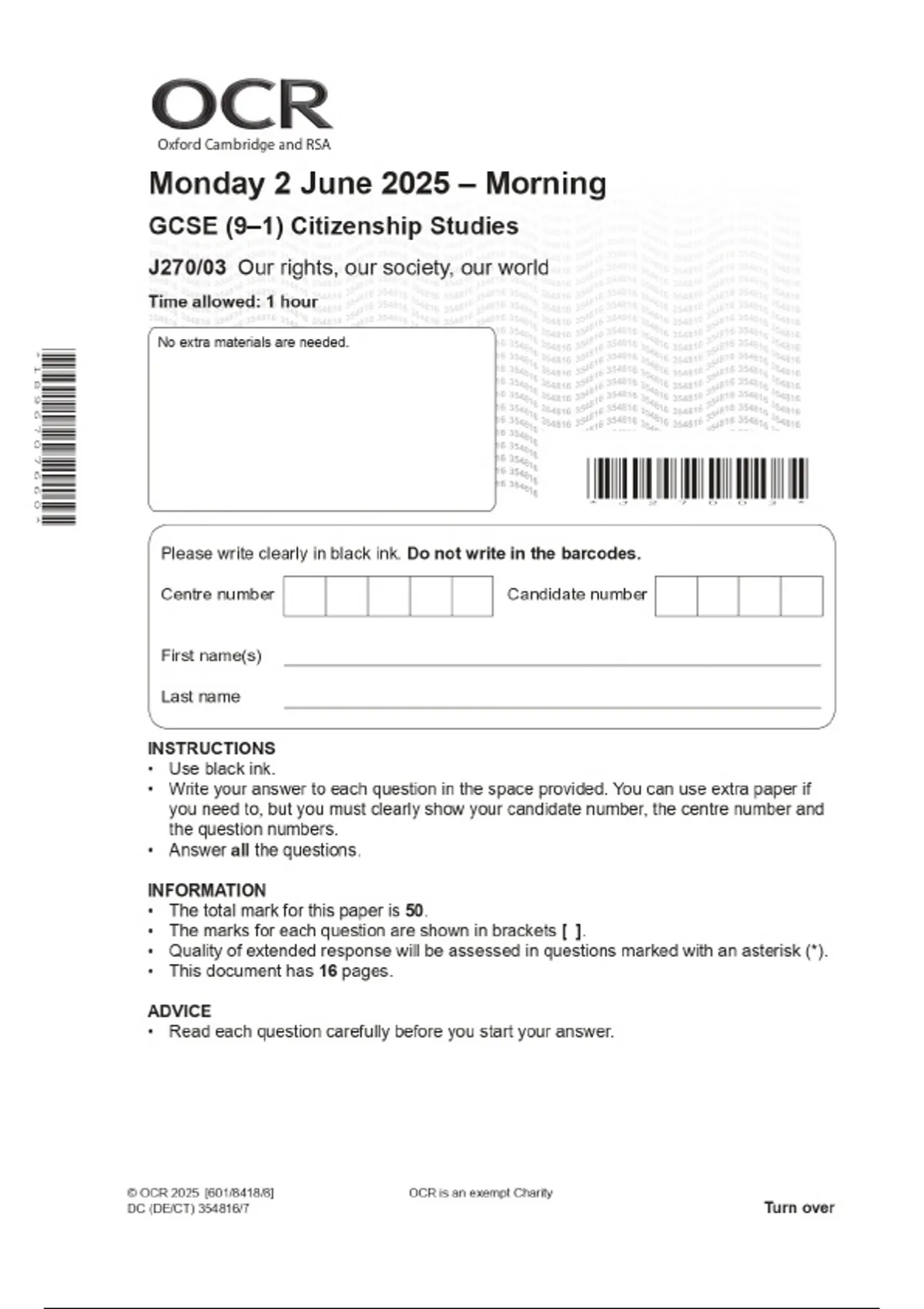 2025 OCR GCSE (9–1) Citizenship Studies J270/03 Our rights, our society, our world Combined Question Paper & Final Marking Scheme