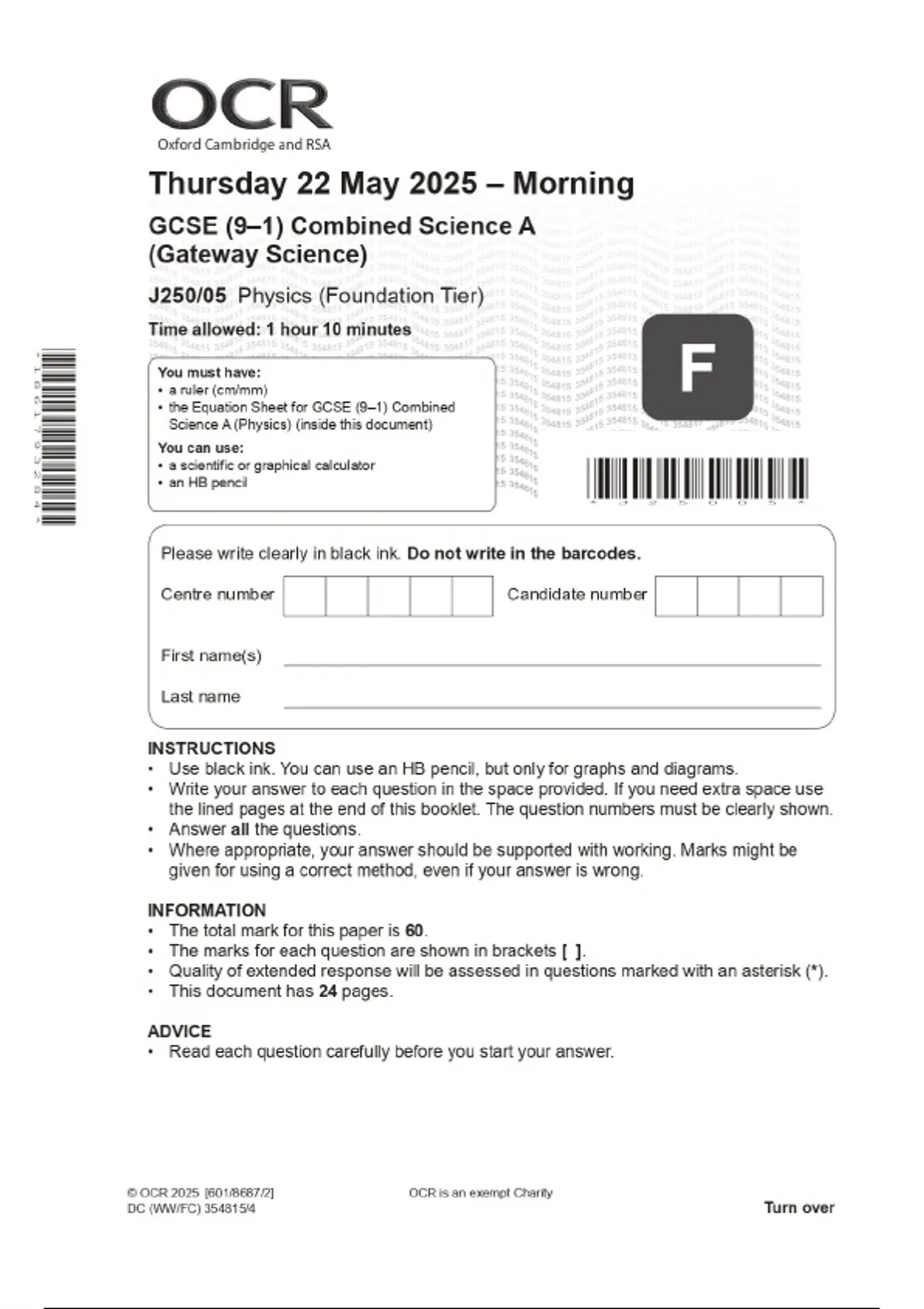 2025 OCR GCSE (9–1) Combined Science A (Gateway Science) J250/05 Physics (Foundation Tier) Combined Question Paper & Final Marking Scheme