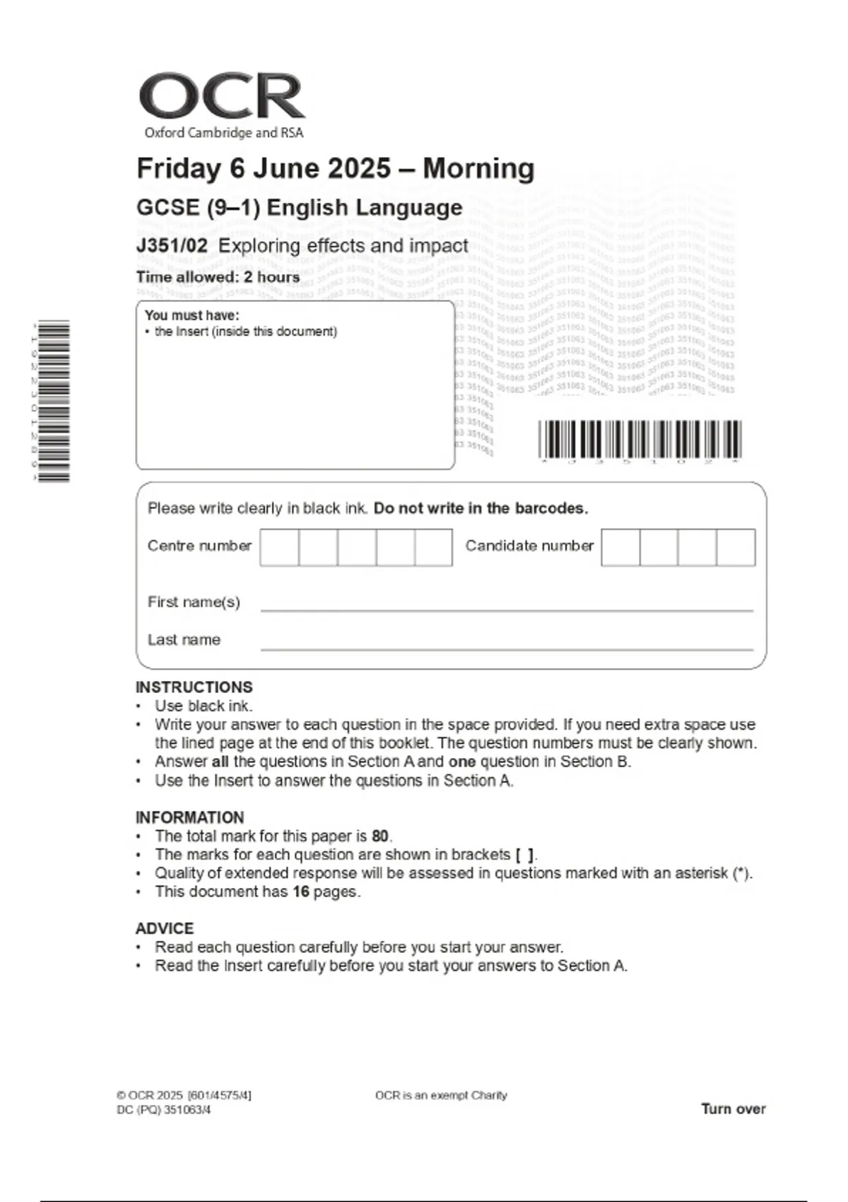 2025 OCR GCSE (9–1) English Language J351/02 Exploring effects and impact Combined Question Paper & Final Marking Scheme