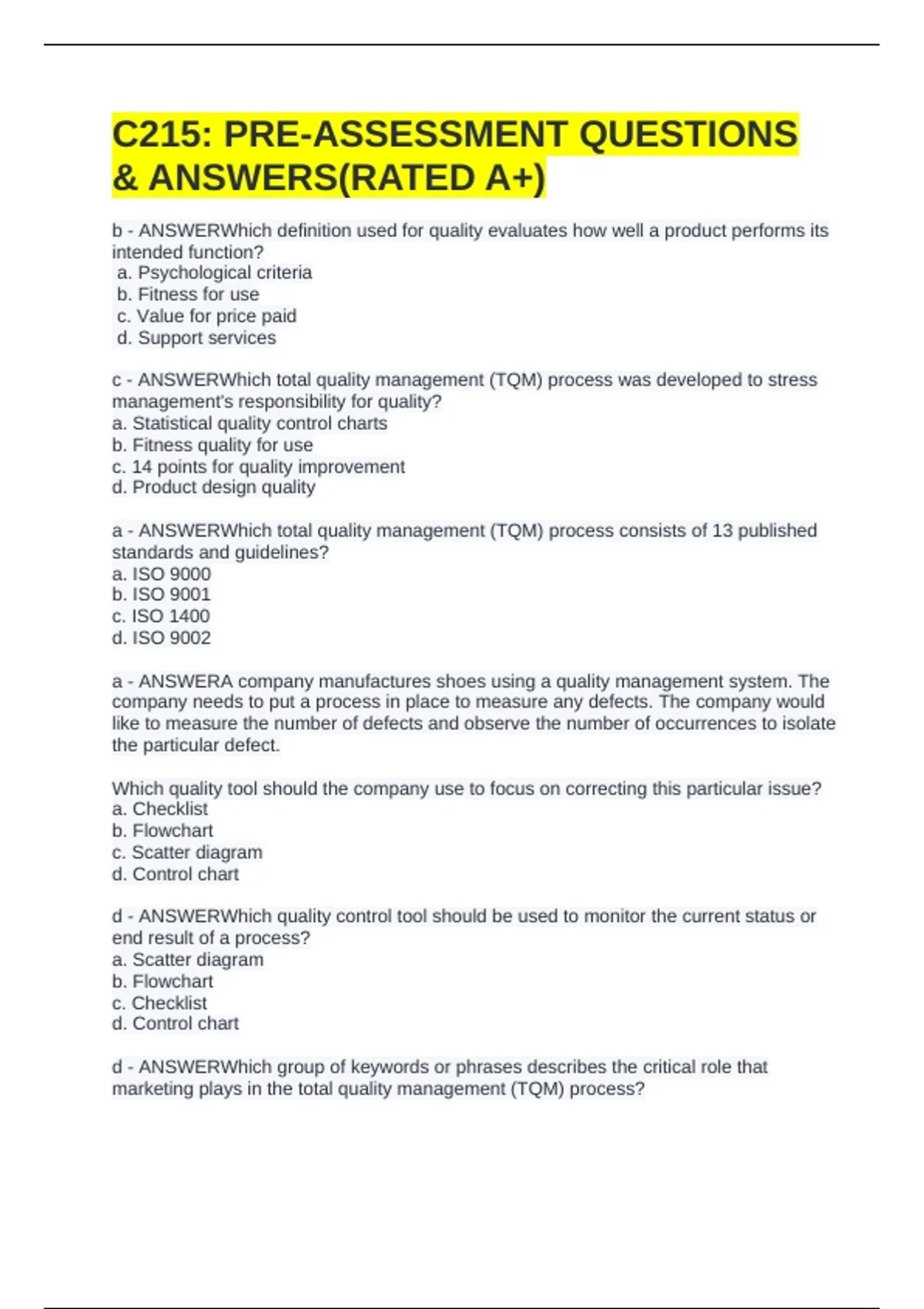 C215: PRE-ASSESSMENT QUESTIONS & ANSWERS(RATED A+)