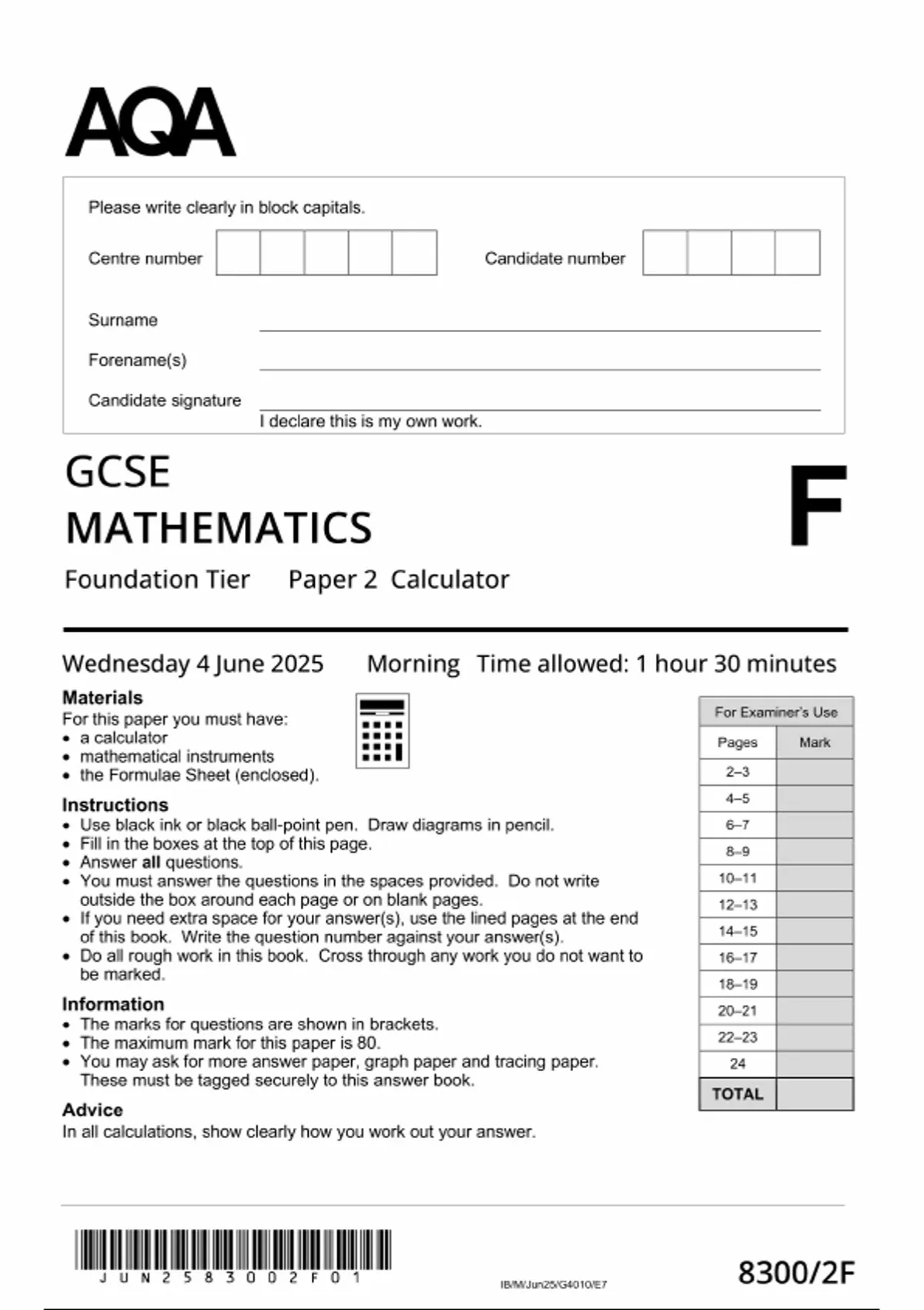 2025 AQA GCSE MATHEMATICS Paper 2 (8300/2F: Calculator Foundation Tier)