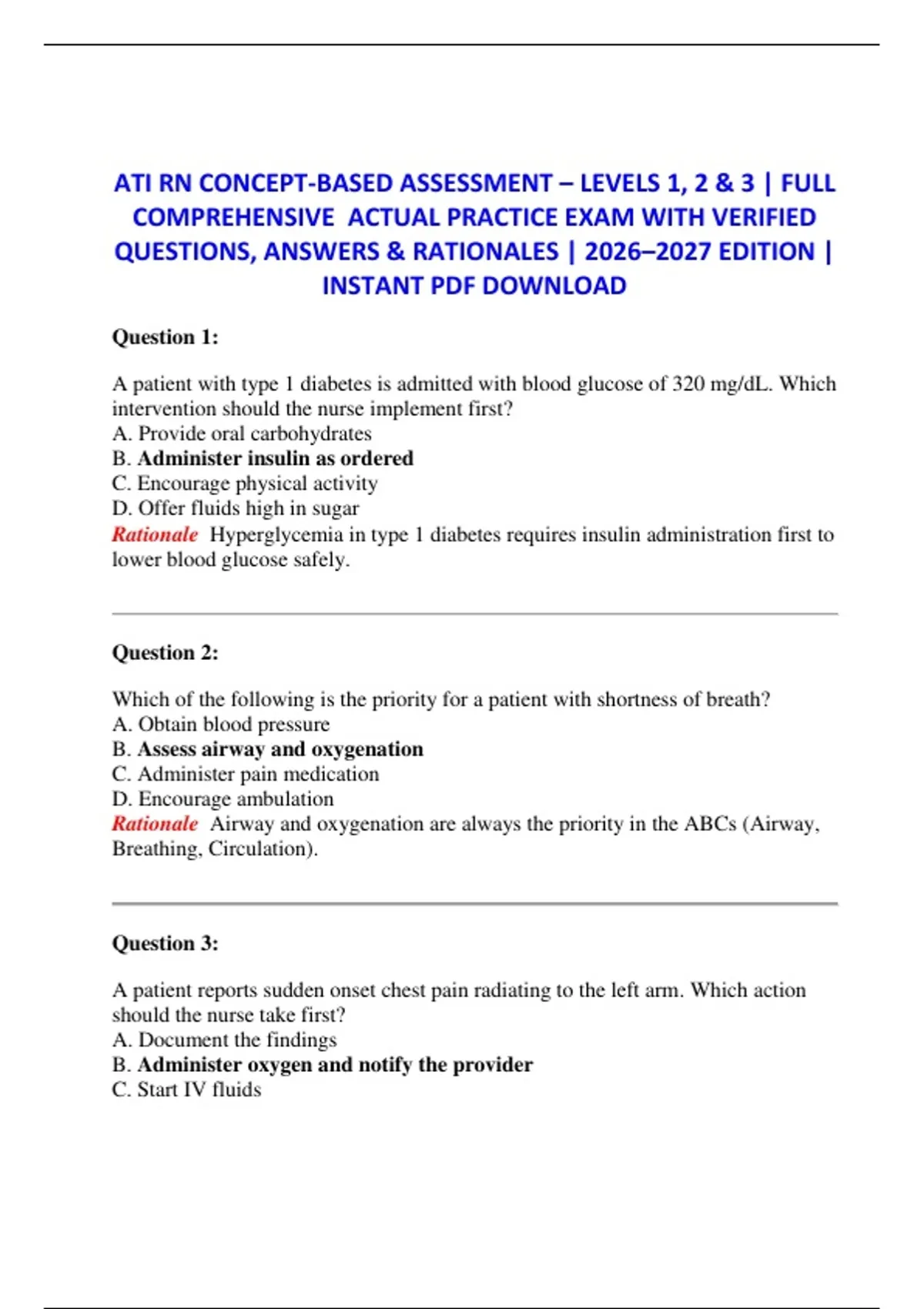 ATI RN CONCEPT-BASED ASSESSMENT – LEVELS 1, 2 & 3 | FULL COMPREHENSIVE ACTUAL PRACTICE EXAM WITH VERIFIED QUESTIONS, ANSWERS & RATIONALES | 2026–2027 EDITION | INSTANT PDF DOWNLOAD