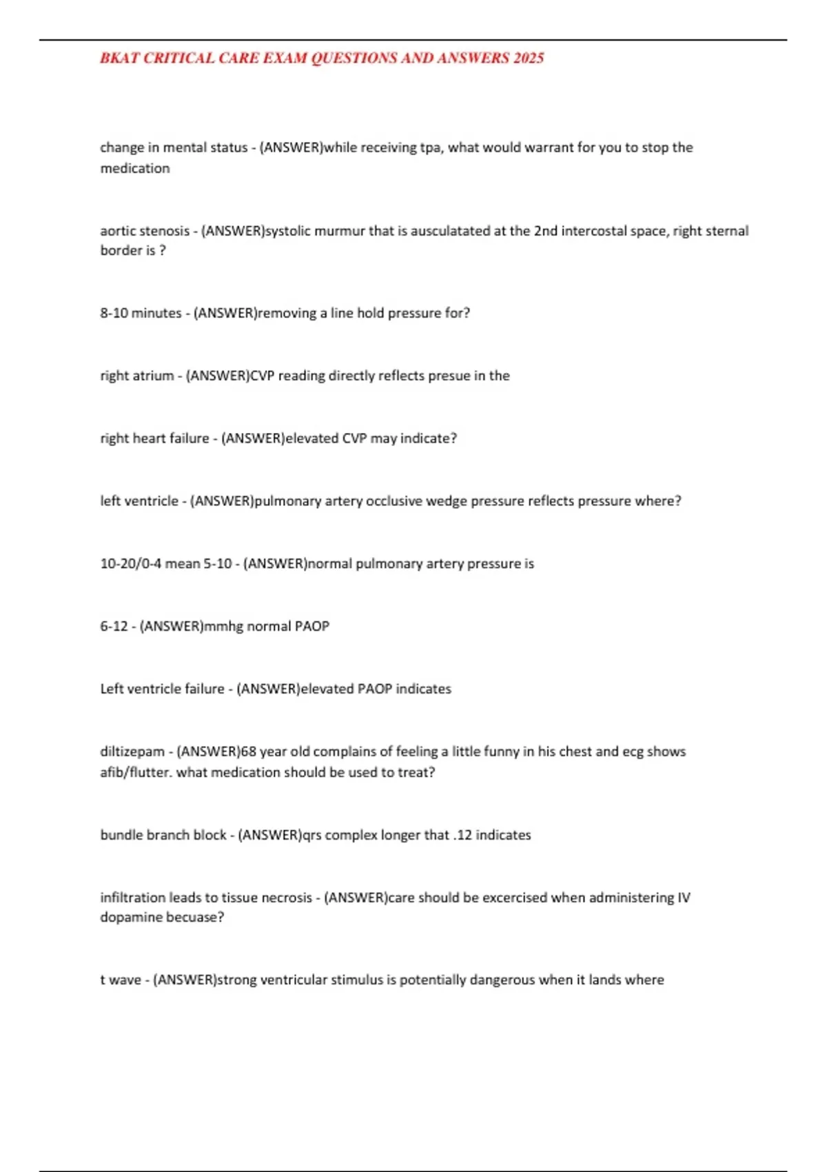 , BKAT CRITICAL CARE EXAM QUESTIONS AND ANSWERS 2025