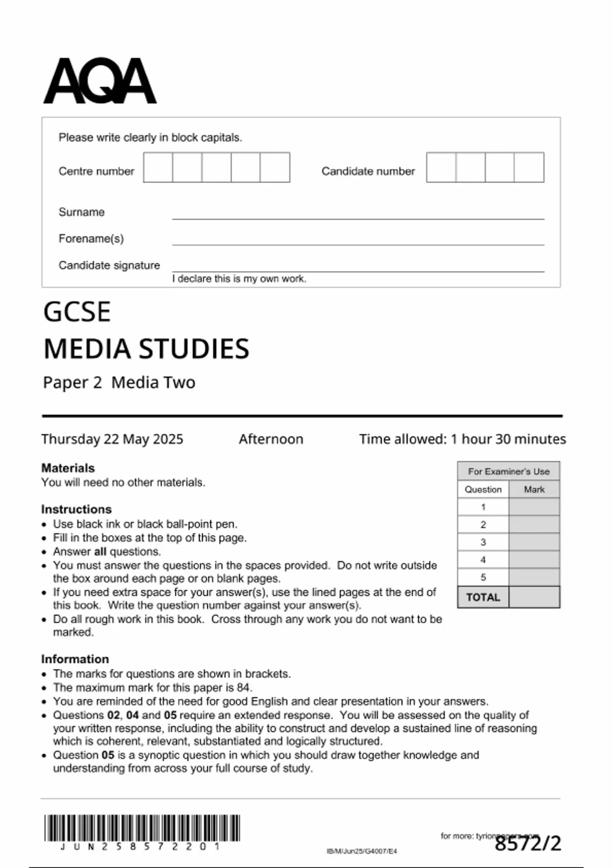 2025 AQA GCSE MEDIA STUDIES Paper 2 (8572/2: Media Two)