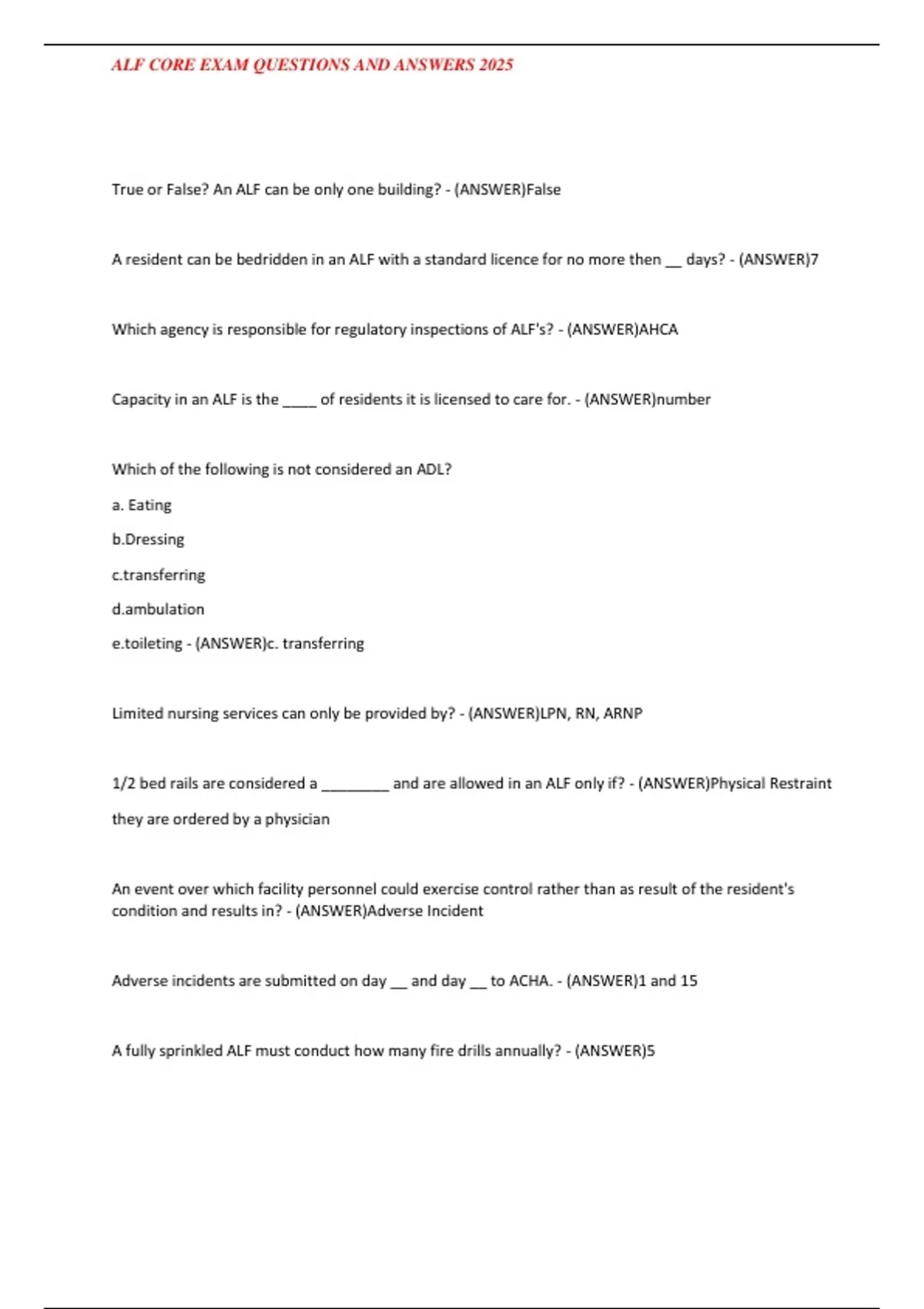 , ALF CORE EXAM QUESTIONS AND ANSWERS 2025