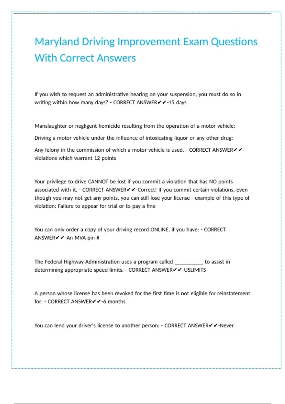 Maryland Driving Improvement Exam Questions