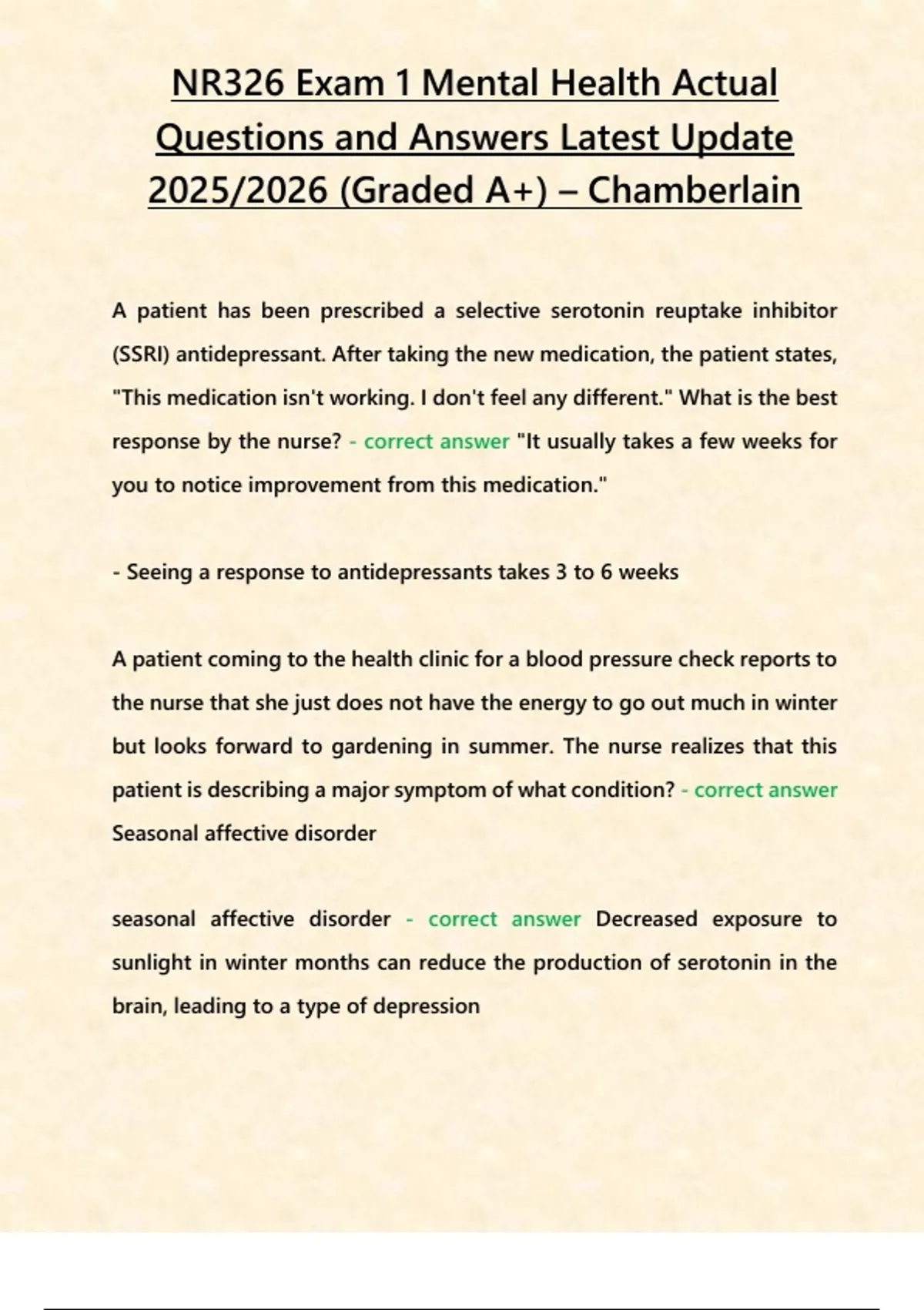 , NR326 Exam 1 Mental Health Actual