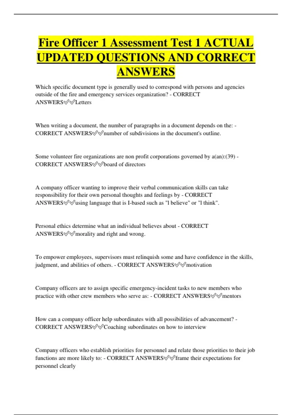 Fire Officer 1 Assessment Test 1 ACTUAL UPDATED QUESTIONS AND CORRECT ANSWERS Which specific document type is generally used to correspond with persons and agencies outside of the fire and emergency services organization? - CORRECT ANSWERSLetters When writing a document, the number of paragraphs in a document depends on the: - CORRECT ANSWERSnumber of subdivisions in the document's outline. Some volunteer fire organizations are non profit corporations governed by a(an):(39) - CORRECT ANSWERSboard of directors A company officer wanting to improve their verbal communication skills can take responsibility for their own personal thoughts and feelings by - CORRECT ANSWERSusing language that is I-based such as "l believe" or "l think". Personal ethics determine what an individual believes about - CORRECT ANSWERSmorality and right and wrong. To empower employees, supervisors must relinquish some and have confidence in the skills, judgment, and abilities of others. - CORRECT ANSWERSmotivation Company officers are to assign specific emergency-incident tasks to new members who practice with other crew members who serve as: - CORRECT ANSWERSmentors How can a company officer help subordinates with all possibilities of advancement? - CORRECT ANSWERSCoaching subordinates