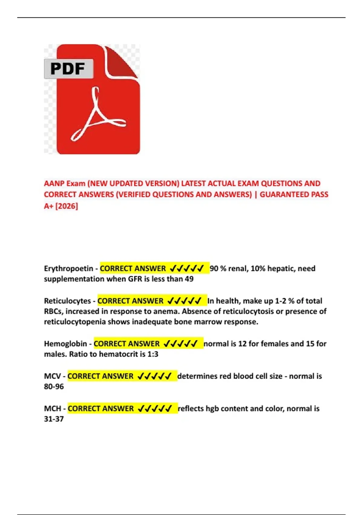 MCH - CORRECT ANSWER ✔✔✔✔✔ reflects hgb content and color, normal is