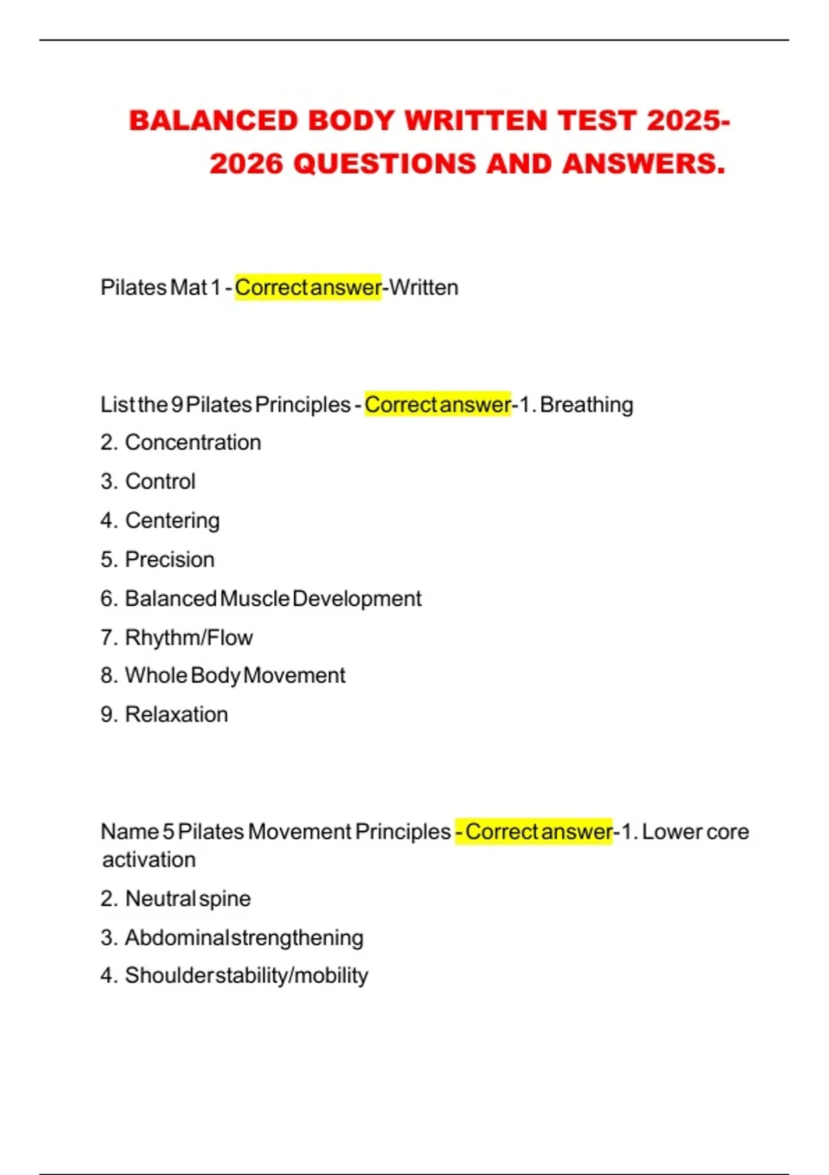 BALANCED BODY WRITTEN TEST QUESTIONS AND ANSWERS.