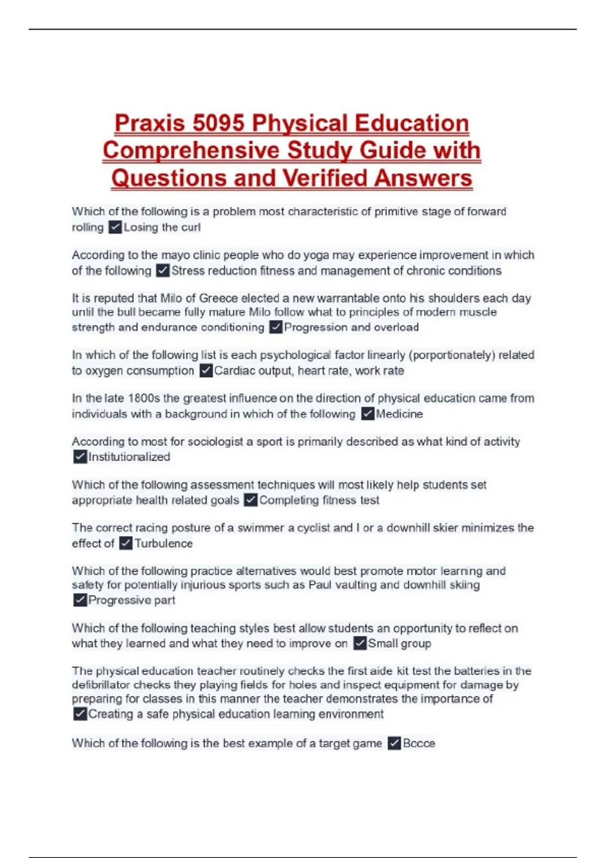 Praxis 5095 Physical Education Comprehensive Study Guide with Questions and Verified Answers Which of the following is a problem most characteristic of primitive stage of forward rolling Losing the curl According to the mayo clinic people who do yoga may experience improvement in which of the following Stress reduction fitness and management of chronic conditions It is reputed that Milo of Greece elected a new warrantable onto his shoulders each day until the bull became fully mature Milo follow what to principles of modern muscle strength and endurance conditioning Progression and overload In which of the following list is each psychological factor linearly (porportionately) related to oxygen consumption Cardiac output, heart rate, work rate In the late 1800s the greatest influence on the direction of physical education came from individuals with a background in which of the following Medicine According to most for sociologist a sport is primarily described as what kind of activity Institutionalized Which of the following assessment techniques will most likely help students set appropriate health related goals Completing fitness test The correct racing posture of a swimmer a cyclist and I or a downhill skier minimizes the effect of Turbulence Which of the following practice alternatives would best promote motor learning and safety for potentially injurious sports such as Paul vaulting and downhill skiing Progressive part Which of the following teaching styles best allow students an opportunity to reflect on what they learned and what they need to improve on Small group The physical education teacher routinely checks the first aide kit test the batteries in the defibrillator checks they playing fields for holes and inspect equipment for damage by preparing for classes in this manner the teacher demonstrates the importance of Creating a safe physical education learning environment Which of the following is the best example of a target game Bocce And teaching a close scale a teacher initially should provide which of the following A stable environment with a stable right of skill performance Which of the following is primarily determined by directly measuring the right of oxygen consumption during exercise Respiratory exchange ratio During a physical education unit that focuses on the development of health related fitness a teacher asked students to keep a journal about their individual responses to three different types of cardiovascular activities such as heart rate perceived right of exertion and motivation and write a journal entry on how they personally felt about each activity this journaling is an example of Differentiated instruction Learning about sports rules and traditions history and etiquette falls under which of the following domains of learning Cognitive Which of the following technology applications would best support a wrestlers learning a new take down technique Recording the wrestlers performance and having the wrestler view it on a video screen This is Addie of health and physical educators is an important resource for beginning physical educators because It's mission is to enhance knowledge improve practice and disseminate current information The best choice of available fitness test for a teacher to use to assess students with disabilities is the Brockport physical fitness test (bpft) Which of the following sets of tasks would be the best for a physical education teacher to complete and adhere to in the beginning of the school year in an effort to establish good classroom management? Establishing rules and reviewing them with students creating a record keeping system and teaching students a predetermined signal to stop activity Which of the following would be the most appropriate way for a teacher to assess the skills of students during a basketball skills unit? Using standardized instruments on basketball skills at the end of the unit Which if the following best expenses the percentage of maximization heart rate that should characterize students exercise for health related fitness in physical education class? 60-85% of maximization heart rate According to research which of the following is true students who are learning a new motor skill in physical education setting? There is no significant relationship between the speed at which students learn the skill and the level of success at which they will perform the skill once it is learned Which of the following is a phase of a stretch shortening cycle SSC Eccentric Which of the following describes the best way and teacher can achieve inclusion in a physical education class Providing various opportunities for students to use their individual strengths and activities Which of the following best describes the learning style of students brainstorming in small groups to choreography Divergent A student who is skipping in zigzag pattern is demonstrating an understanding of which of the following movement concepts Space awareness Which of the following best describes the stance held by the society of physical educators formerly the American alliance of health physical education recreation and dance with regard to using human targets during physical education activities It should never be taught because it can result in negative experiences for students Which of the following is the smallest of the four muscles in the buttocks Tensor fasciae latae What is the definition of body mass index The ratio of weight to height squared In the history of research into motor development which of the following represents the trend from earlier to later findings From maturation to me maturation plus experience Related to summation of forces which is accurate about how body parts move? The largest body parts are the slowest and move first Which of the following is true about center of gravity(COG) CO G varies according to the body parts positions If one skater has longer arms and another has shorter arms and someone applies equal force to each 