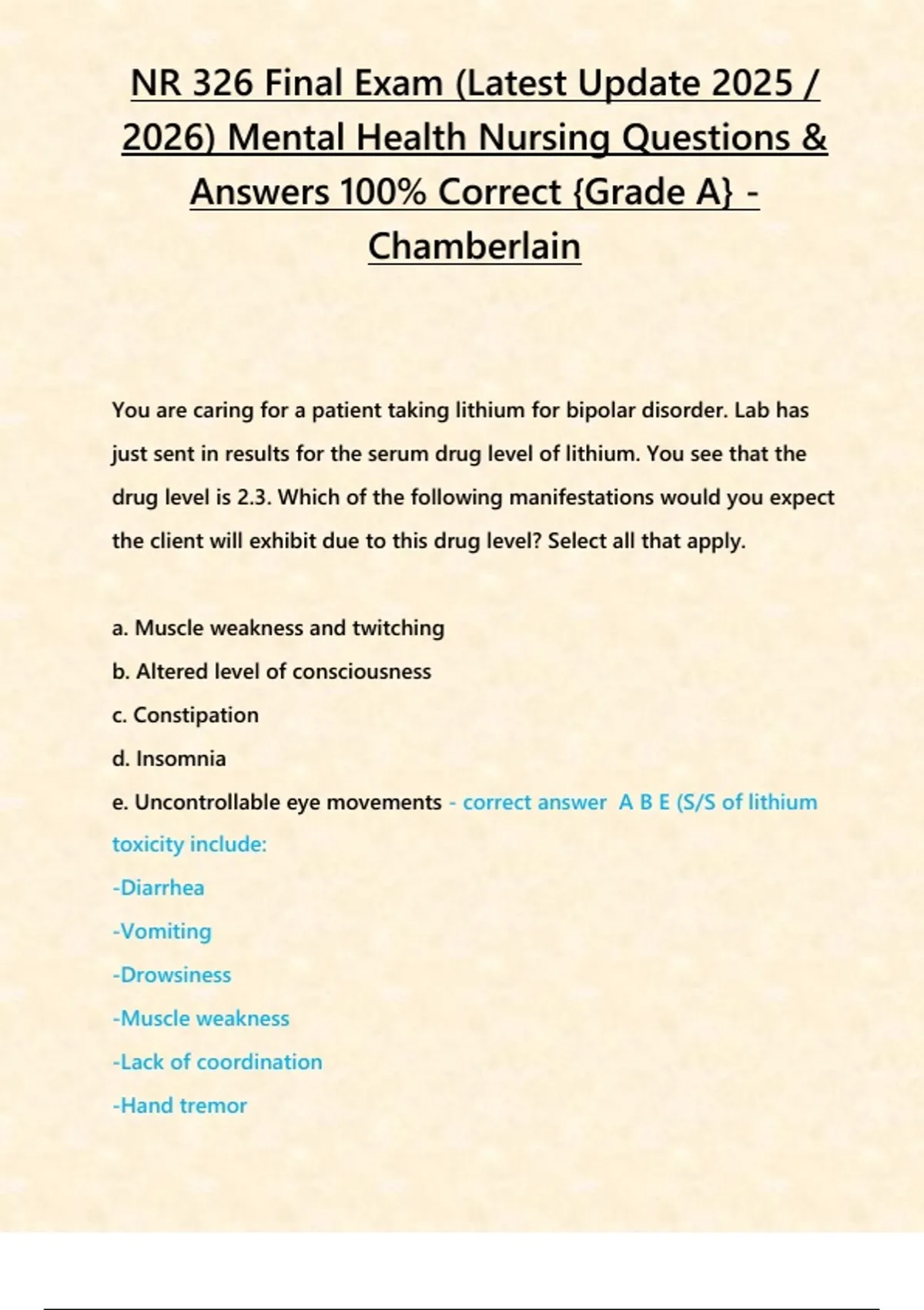 e. Uncontrollable eye movements - correct answer A B E (S/S of lithium