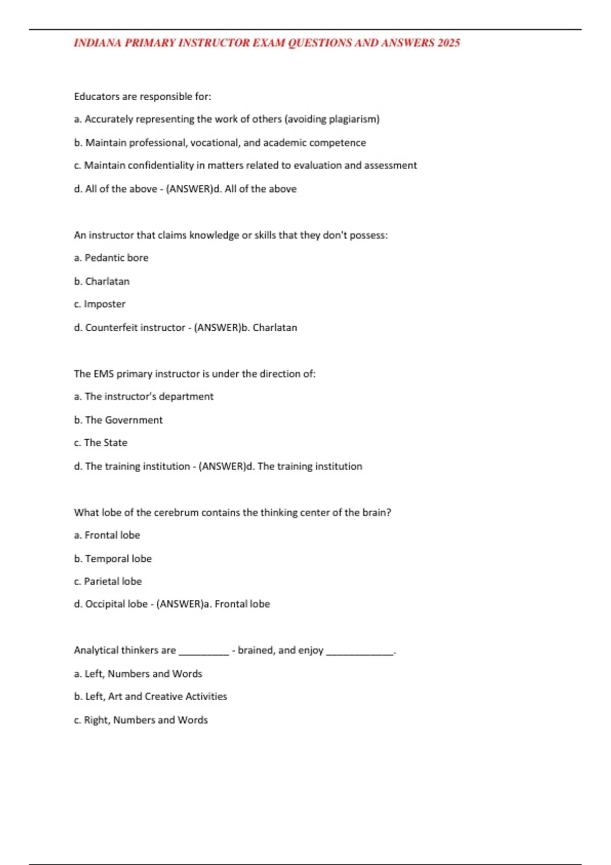 INDIANA PRIMARY INSTRUCTOR EXAM QUESTIONS AND ANSWERS 2025