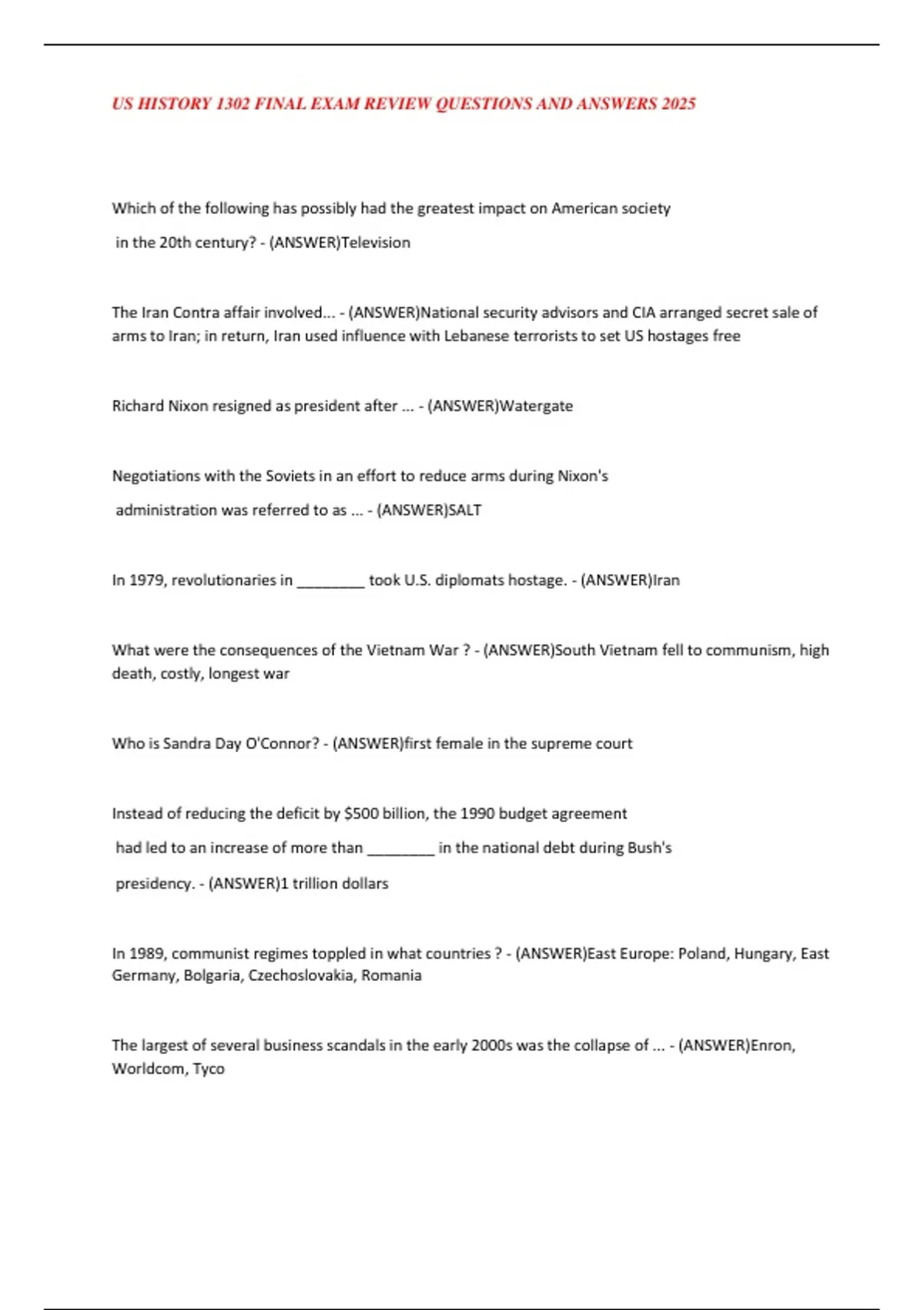 , US HISTORY 1302 FINAL EXAM REVIEW QUESTIONS AND ANSWERS 2025