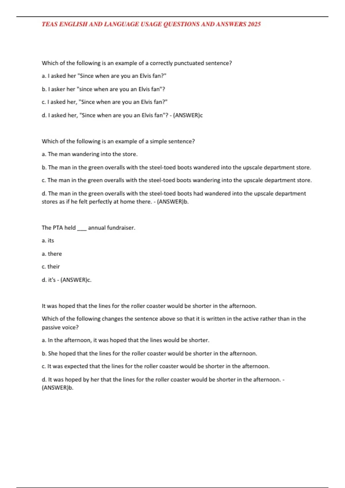 , TEAS ENGLISH AND LANGUAGE USAGE QUESTIONS AND ANSWERS 2025