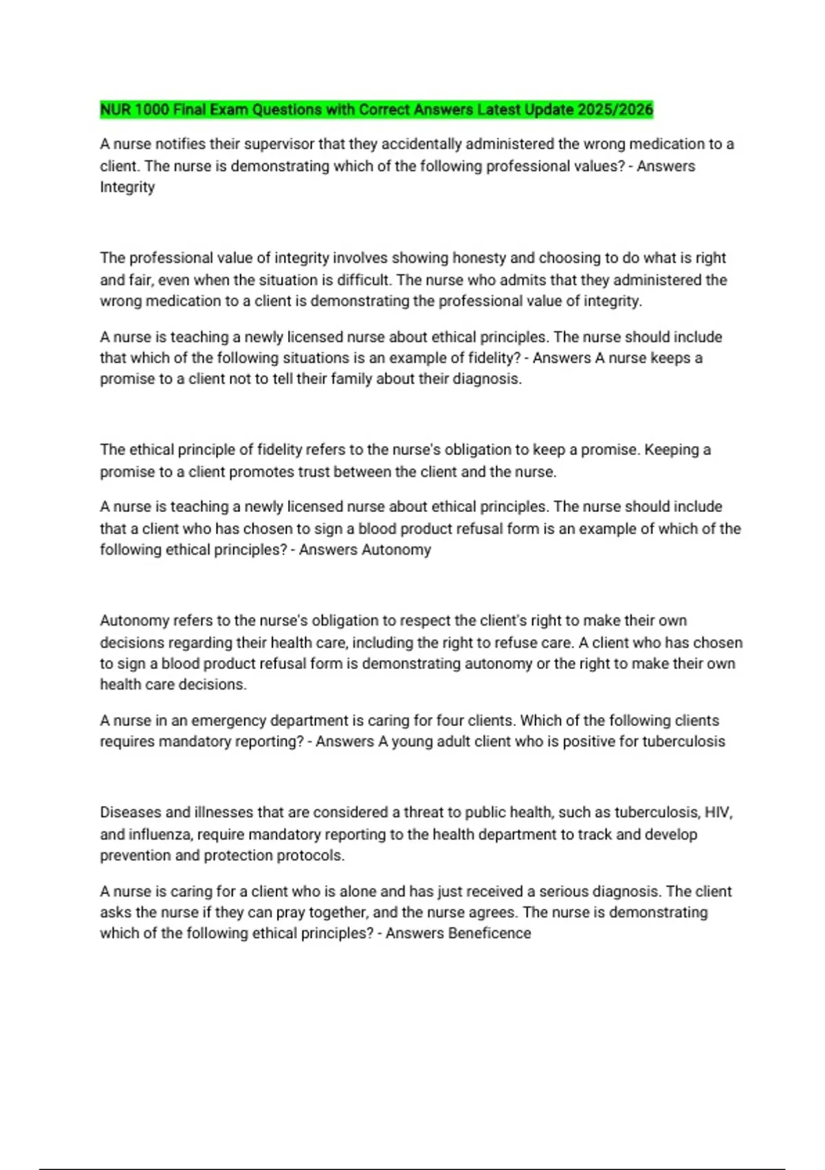 NUR 1000 Final Exam Questions with Correct Answers Latest Update 2025/2026 A nurse notifies their supervisor that they accidentally administered the wrong medication to a client. The nurse is demonstrating which of the following professional values? - Answers Integrity The professional value of integrity involves showing honesty and choosing to do what is right and fair, even when the situation is difficult. The nurse who admits that they administered the wrong medication to a client is demonstrating the professional value of integrity. A nurse is teaching a newly licensed nurse about ethical principles. The nurse should include that which of the following situations is an example of fidelity? - Answers A nurse keeps a promise to a client not to tell their family about their diagnosis. The ethical principle of fidelity refers to the nurse's obligation to keep a promise. Keeping a promise to a client promotes trust between the client and the nurse. A nurse is teaching a newly licensed nurse about ethical principles. The nurse should include that a client who has chosen to sign a blood product refusal form is an example of which of the following ethical principles? - Answers Autonomy Autonomy refers to the nurse's obligation to respect the client's right to make their own decisions regarding their health care, including the right to refuse care. A client who has chosen to sign a blood product refusal form is demonstrating autonomy or the right to make their own health care decisions. A nurse in an emergency department is caring for four clients. Which of the following clients requires mandatory reporting? - Answers A young adult client who is positive for tuberculosis Diseases and illnesses that are considered a threat to public health, such as tuberculosis, HIV, and influenza, require mandatory reporting to the health department to track and develop prevention and protection protocols. A nurse is caring for a client who is alone and has just received a serious diagnosis. The client asks the nurse if they can pray together, and the nurse agrees. The nurse is demonstrating which of the following ethical principles? - Answers Beneficence The ethical principle of beneficence refers to the nurse's obligation to implement actions that minimize harm and benefit clients. Beneficence includes meeting a client's physical, social, or emotional needs. The nurse is demonstrating beneficence by providing comfort and praying with the client who is alone A nurse is providing privacy for a client who has incontinence. The nurse is demonstrating which of the following professional values? - Answers Human dignity