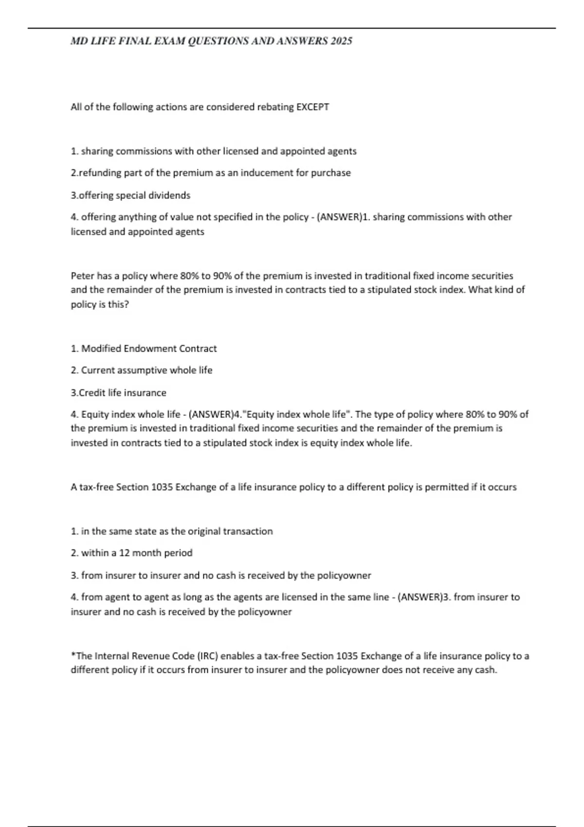 , MD LIFE FINAL EXAM QUESTIONS AND ANSWERS 2025