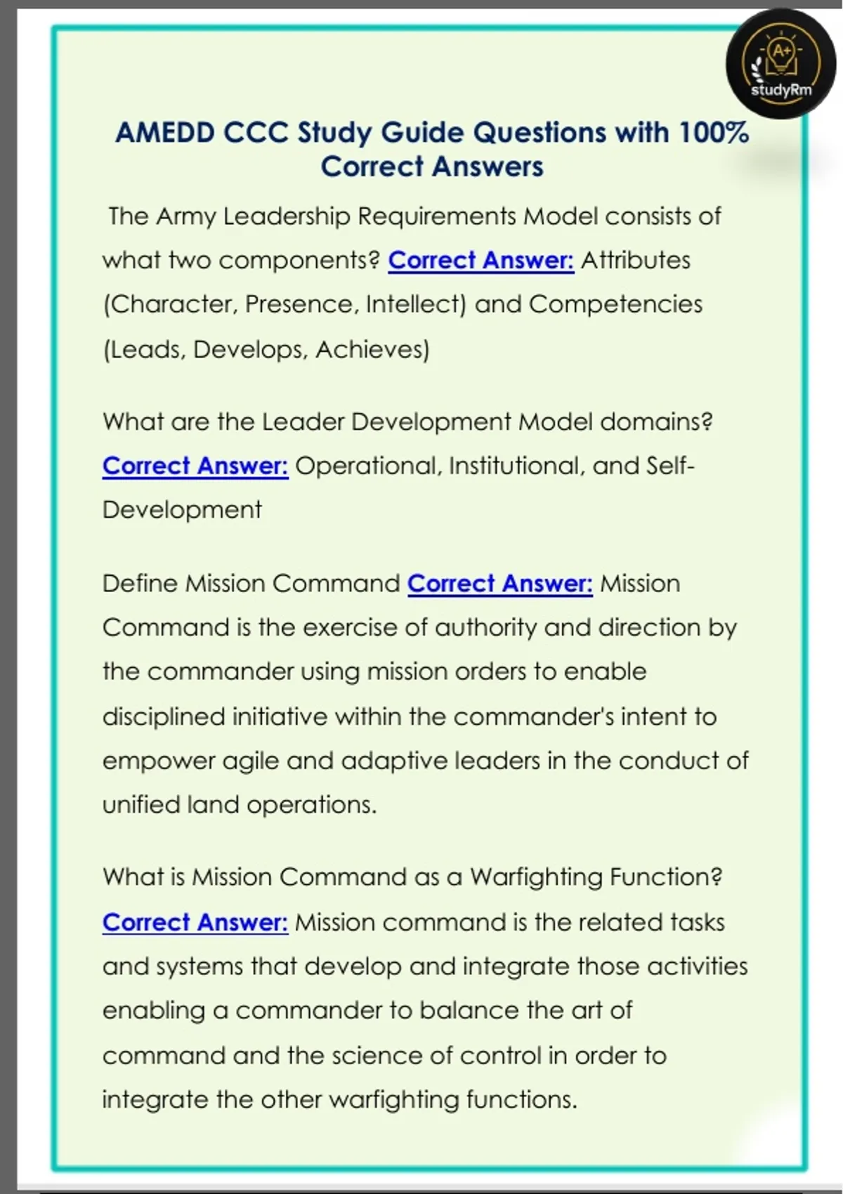 AMEDD CCC Study Guide Questions with 100%