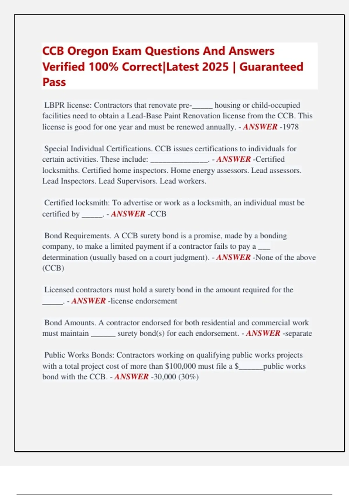 CCB Oregon Exam Questions And Answers Verified 100% Correct|Latest 2025 | Guaranteed Pass LBPR license: Contractors that renovate pre-_____ housing or child-occupied facilities need to obtain a Lead-Base Paint Renovation license from the CCB. This license is good for one year and must be renewed annually. - ANSWER -1978 Special Individual Certifications. CCB issues certifications to individuals for certain activities. These include: ______________. - ANSWER -Certified locksmiths. Certified home inspectors. Home energy assessors. Lead assessors. Lead Inspectors. Lead Supervisors. Lead workers. Certified locksmith: To advertise or work as a locksmith, an individual must be certified by _____. - ANSWER -CCB Bond Requirements. A CCB surety bond is a promise, made by a bonding company, to make a limited payment if a contractor fails to pay a ___ determination (usually based on a court judgment). - ANSWER -None of the above (CCB) Licensed contractors must hold a surety bond in the amount required for the _____. - ANSWER -license endorsement Bond Amounts. A contractor endorsed for both residential and commercial work must maintain ______ surety bond(s) for each endorsement. - ANSWER -separate Public Works Bonds: Contractors working on qualifying public works projects with a total project cost of more than $100,000 must file a $______public works bond with the CCB. - ANSWER -30,000 (30%) Insurance Requirements. A licensed contractor must maintain liability insurance to cover claims a client (or other third party) might file based on the contractor's work. - ANSWER -TRUE Maintaining a Contractor License. Address Changes: Contractors have _____ to notify the CCB of any address change. This applies while licensed and for one year following the license expiration. - ANSWER -10 days Contractors that change business entities (such as a sole proprietor to corporation) must complete a new license application, pay new fees and provide a new bond and insurance. The CCB will re-issue the same license number. Typically, if a partner departs, the contractor must obtain a new license. - ANSWER -TRUE Contractors must notify the CCB when they add or remove official personnel such as corporate officers or members. - ANSWER -TRUE Contractors who temporarily stop working may not place their license on inactive status. - ANSWER -FALSE Contractor licenses renew every ____ year(s). - ANSWER -2 Written Contracts. A Contractor who works for an owner of a residential structure or a zero-lot-line dwelling must have a written contract with the owner if the contract price is more than $_______. - ANSWER -2000 A contract for work on residential property may limit a person's right to file a complaint for damages with CCB. - ANSWER -FALSE Warranties. Residential Warranties: A contractor must offer warranty against defects in materials and workmanship if the contractor does either of the following: - ANSWER -enters into contract to construct a new residential structure or zero lot-line dwelling AND sells a new residential structure or dwelling constructed as a "spec" home Warranties. Commercial Warranties: A commercial general contractor who constructs a new, large commercial structure must provide the owner with a ___ year warranty against defects in materials and workmanship that covers the building envelope and penetration components. - ANSWER -2 Dispute Resolution. The CCB ___ complaints against licensed contractors - ANSWER -Accepts An employee may file a complaint against a licensed contractor within ___from the date the wages were earned. - ANSWER -1 year An equipment or material supplier, or licensed subcontractor, may file a complaint against a licensed contractor within one year from the date the materials were sold or within one year from the date the work was performed. - ANSWER -TRUE ______ who wants to file a complaint against a contractor must notify the contractor before filing the complaint. - ANSWER -None of the above The CCB does not charge a processing fee for a complaint against a commercial contractor. - ANSWER -TRUE Complaints Against Residential Contractors. When both parties participate, CCB mediators help settle more than 70 percent of complaints that go to mediation. Settlement normally resolves the complaint with the least amount of time and money. - ANSWER -TRUE A licensed contractor may be sanctioned for knowingly assisting an unlicensed person to act as a contractor. - ANSWER -TRUE A contractor is not required to include their CCB license number on ____. - ANSWER -permanent signs at a contractor's place of business Grounds for license denial may include ______ - ANSWER -criminal convictions AND failure to pay debts