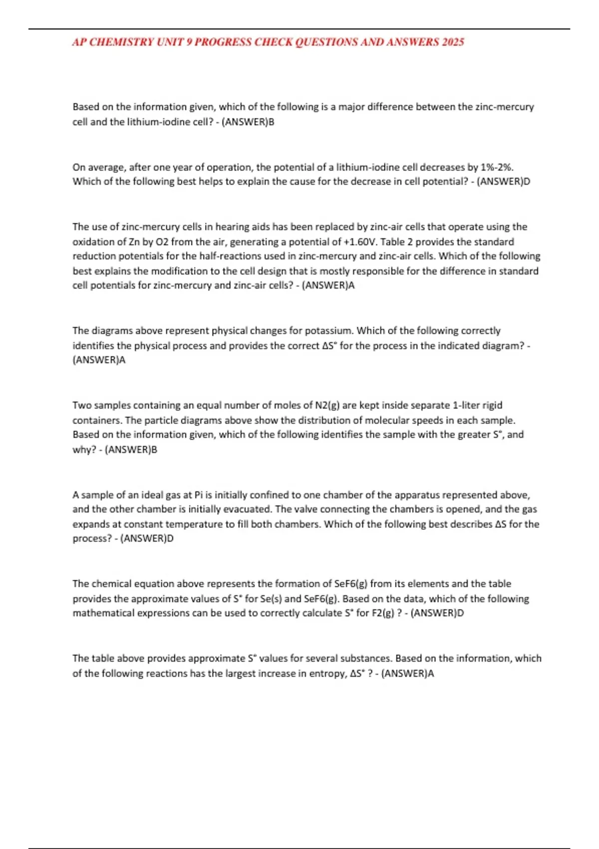 , AP CHEMISTRY UNIT 9 PROGRESS CHECK QUESTIONS AND ANSWERS 2025