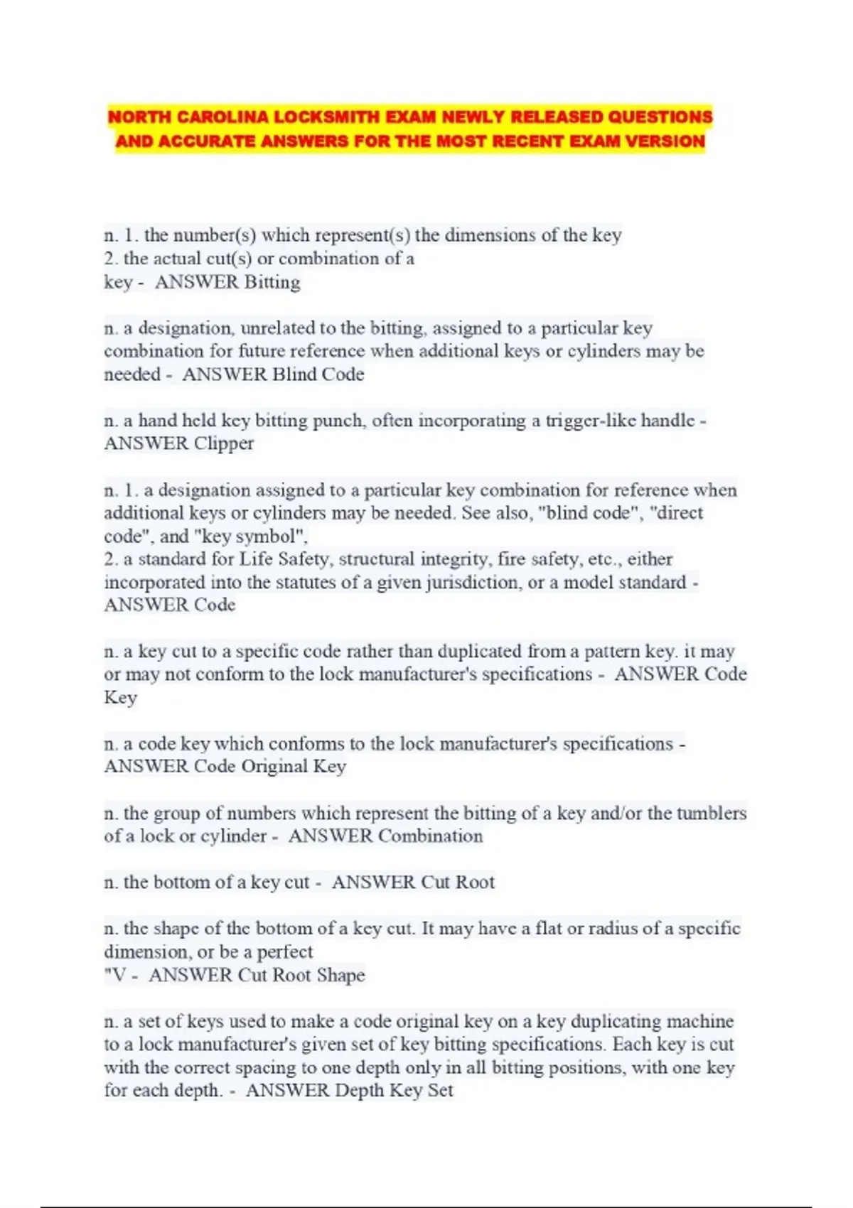 NORTH CAROLINA LOCKSMITH EXAM NEWLY RELEASED QUESTIONS AND ACCURATE ANSWERS FOR THE MOST RECENT EXAM VERSION....
