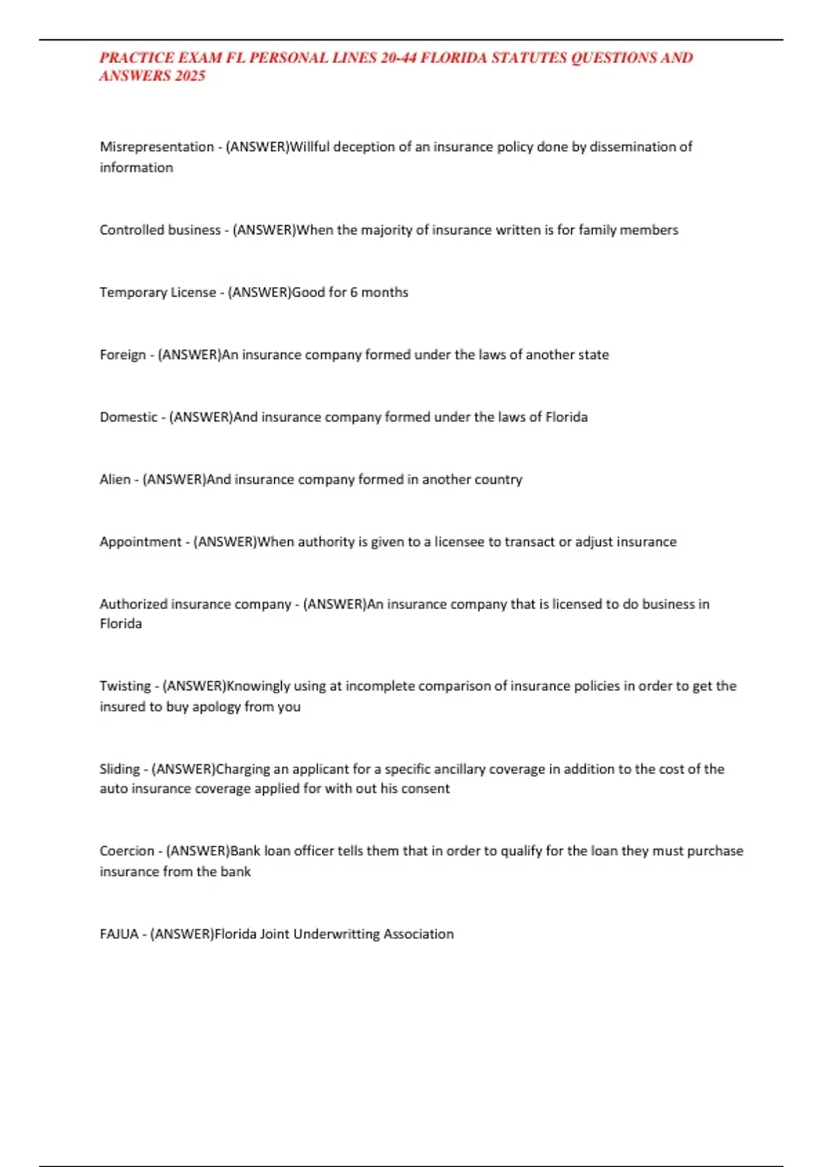 PRACTICE EXAM FL PERSONAL LINES 20-44 FLORIDA STATUTES QUESTIONS AND ANSWERS 2025