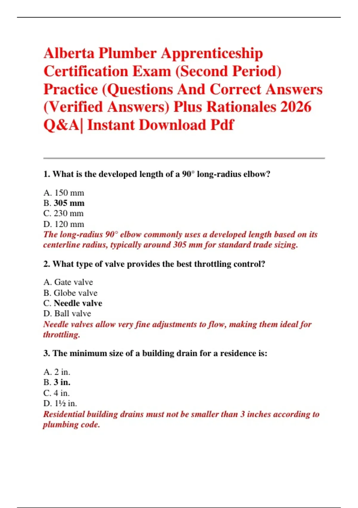 Alberta Plumber Apprenticeship Certification Exam (Second Period) Practice (Questions And Correct Answers (Verified Answers) Plus Rationales 2026 Q&A| Instant Download Pdf