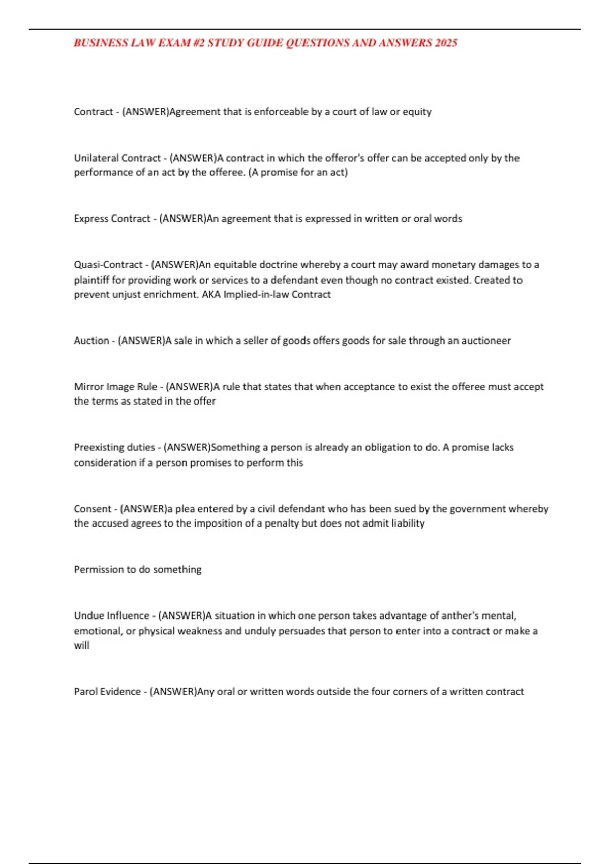 , BUSINESS LAW EXAM #2 STUDY GUIDE QUESTIONS AND ANSWERS 2025