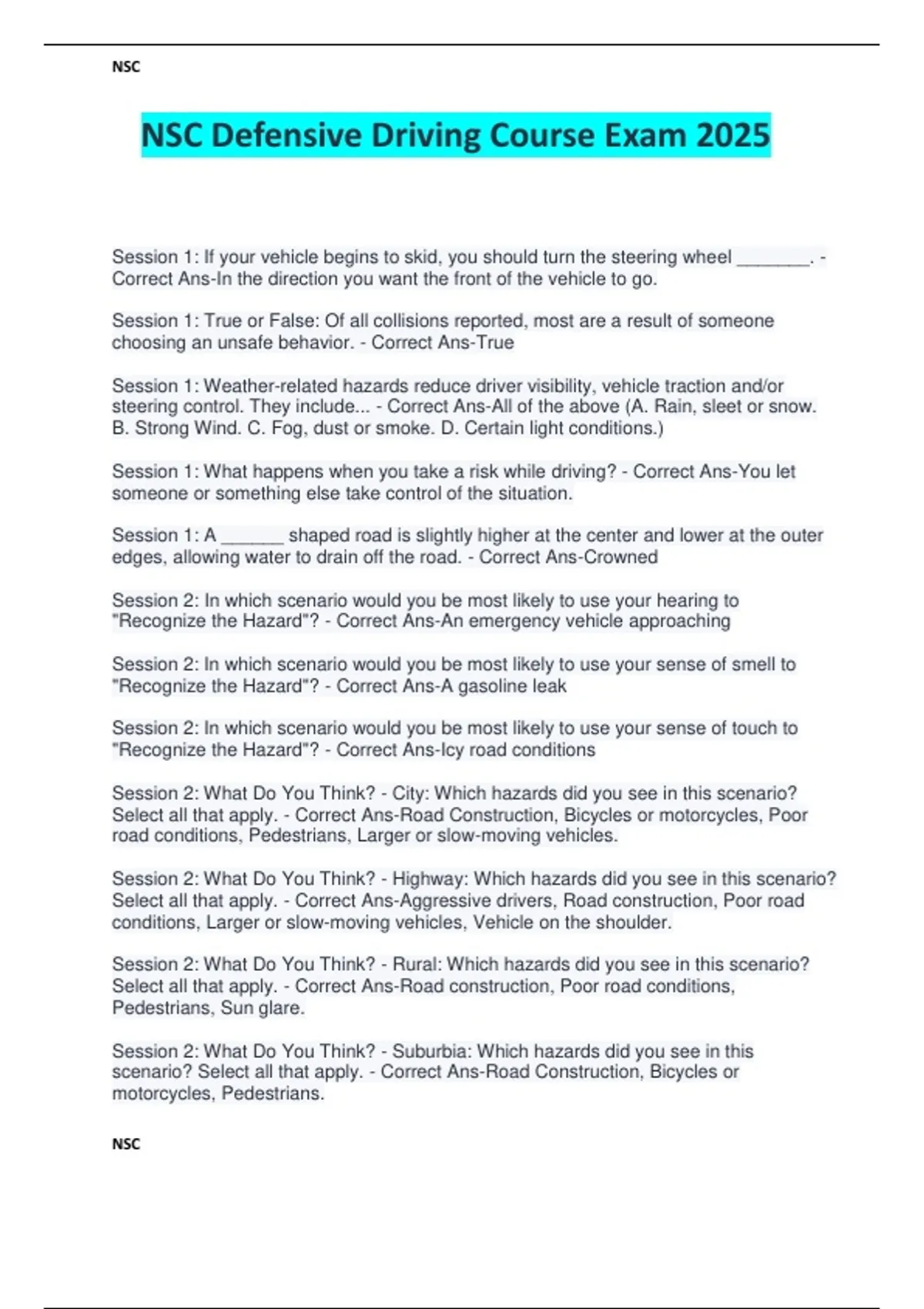 NSC Defensive Driving Course Exam 2025 Session 1: If your vehicle begins to skid, you should turn the steering wheel _______. - Correct Ans-In the direction you want the front of the vehicle to go. Session 1: True or False: Of all collisions reported, most are a result of someone choosing an unsafe behavior. - Correct Ans-True Session 1: Weather-related hazards reduce driver visibility, vehicle traction and/or steering control. They include... - Correct Ans-All of the above (A. Rain, sleet or snow. B. Strong Wind. C. Fog, dust or smoke. D. Certain light conditions.) Session 1: What happens when you take a risk while driving? - Correct Ans-You let someone or something else take control of the situation. Session 1: A ______ shaped road is slightly higher at the center and lower at the outer edges, allowing water to drain off the road. - Correct Ans-Crowned Session 2: In which scenario would you be most likely to use your hearing to "Recognize the Hazard"? - Correct Ans-An emergency vehicle approaching Session 2: In which scenario would you be most likely to use your sense of smell to "Recognize the Hazard"? - Correct Ans-A gasoline leak Session 2: In which scenario would you be most likely to use your sense of touch to "Recognize the Hazard"? - Correct Ans-Icy road conditions Session 2: What Do You Think? - City: Which hazards did you see in this scenario? Select all that apply. - Correct Ans-Road Construction, Bicycles or motorcycles, Poor road conditions, Pedestrians, Larger or slow-moving vehicles. Session 2: What Do You Think? - Highway: Which hazards did you see in this scenario? Select all that apply. - Correct Ans-Aggressive drivers, Road construction, Poor road conditions, Larger or slow-moving vehicles, Vehicle on the shoulder. Session 2: What Do You Think? - Rural: Which hazards did you see in this scenario? Select all that apply. - Correct Ans-Road construction, Poor road conditions, Pedestrians, Sun glare. Session 2: What Do You Think? - Suburbia: Which hazards did you see in this scenario? Select all that apply. - Correct Ans-Road Construction, Bicycles or motorcycles, Pedestrians. NSC NSC Session 2: "I can move around, back and forth, in my shoulder harness, so the seat belt isn't working." Fact or Fiction? - Correct Ans-Fiction Session 2: "Seat belts trap passengers in burning or submerged vehicles." Fact or Fiction? - Correct Ans-Fiction Session 2: What is defensive driving? - Correct Ans-Driving to save lives, time and money in spite of the conditions around you and the actions of others. Session 2: A preventable collision is a collision in which the driver fails to do everything ____ to avoid it. - Correct Ans-Reasonable Session 2: What are the three basic steps in the NSC Collision Prevention Formula? - Correct Ans-Recognize, Understand, Act. Session 2: Which one of the following is a way to focus your attention on driving so that you can recognize a hazard and understand the defense against it? - Correct Ans-The "What If?" Strategy Session 2: Seat belts increase your chances of surviving a collision by more than ____ percent. - Correct Ans-50 percent Session 3: "My vehicle can stop just as fast as the one I'm following." Fact or Fiction? - Correct Ans-Fiction Session 3: You are driving on a congested three-lane expressway during morning rush hour, going east as the sun is rising. What is the minimum number of seconds needed for following distance? - Correct Ans-5 seconds Session 3: You are following a truck on a two-lane rural highway in the rain. What is the minimum number of seconds needed for following distance? - Correct Ans-6 seconds Session 3: If you find that you are becoming aggravated or choosing unsafe, aggressive behaviors, what three steps can you take to regain control? - Correct Ans-Reflect, Reframe, Refocus Session 3: _____ is the number one unsafe driving behavior that contributes to collisions and violations. - Correct Ans-Improper speed Session 3: _____ is the distance a vehicle travels from the moment an event occurs until you see it and become aware of the danger. - Correct Ans-Perception distance Session 3: Always keep, at a minimum, a _____-second following distance behind the vehicle in front of you. - Correct Ans-Three-second NSC NSC Session 3: NHTSA reports that the average text takes the driver's eyes off the road for _____ seconds. - Correct Ans-4.6 seconds Session 4: What hazards did you identify? Did you notice the driver is speeding, driving erratically and not using turn signals? The truck ahead is billowing smoke, which indicates that it's disabled and slowing down. What should the driver do? - Correct Ans Reduce Speed Session 4: You are in the grey car in front and being tailgated and harassed by the red car. What should you do? - Correct Ans-Reduce Speed And Move Over. Session 4: Friend #1 thinks he's fine to drive, but friend #2 is worried. What should friend #1 do? - Correct Ans-Call a Rideshare Session 4: What should this woman do? - Correct Ans-Pulling Over Session 4: True or False: Sleeping for less than 8 hours a night interrupts your circadian rhythms and impairs cognitive performance. - Correct Ans-True Session 4: True or False: Road signs use color and shape to help you identify the type and purpose of the sign. - Correct Ans-True Session 4: True or False: It is acceptable to increase the speed of your vehicle over the legal speed limit to merge onto a highway. - Correct Ans-False Session 4: True or False: Your ability to drive safely can be impaired by use of certain over-the-counter drugs. - Correct Ans-True Session 4: Blood Alcohol Content (BAC) is impacted by ______. - Correct Ans-All of the above (A person's body weight, The alcohol concentration of the drink, A person's gender, The time between drinks) Session 5: If two vehicles come from different directions and stop at a Stop sign, who has the right-of-way? - Correct Ans-Neither Vehicle has the right-of-way Session 5: Follow the four Rs (Read, Right, Reduce and Ride) wh