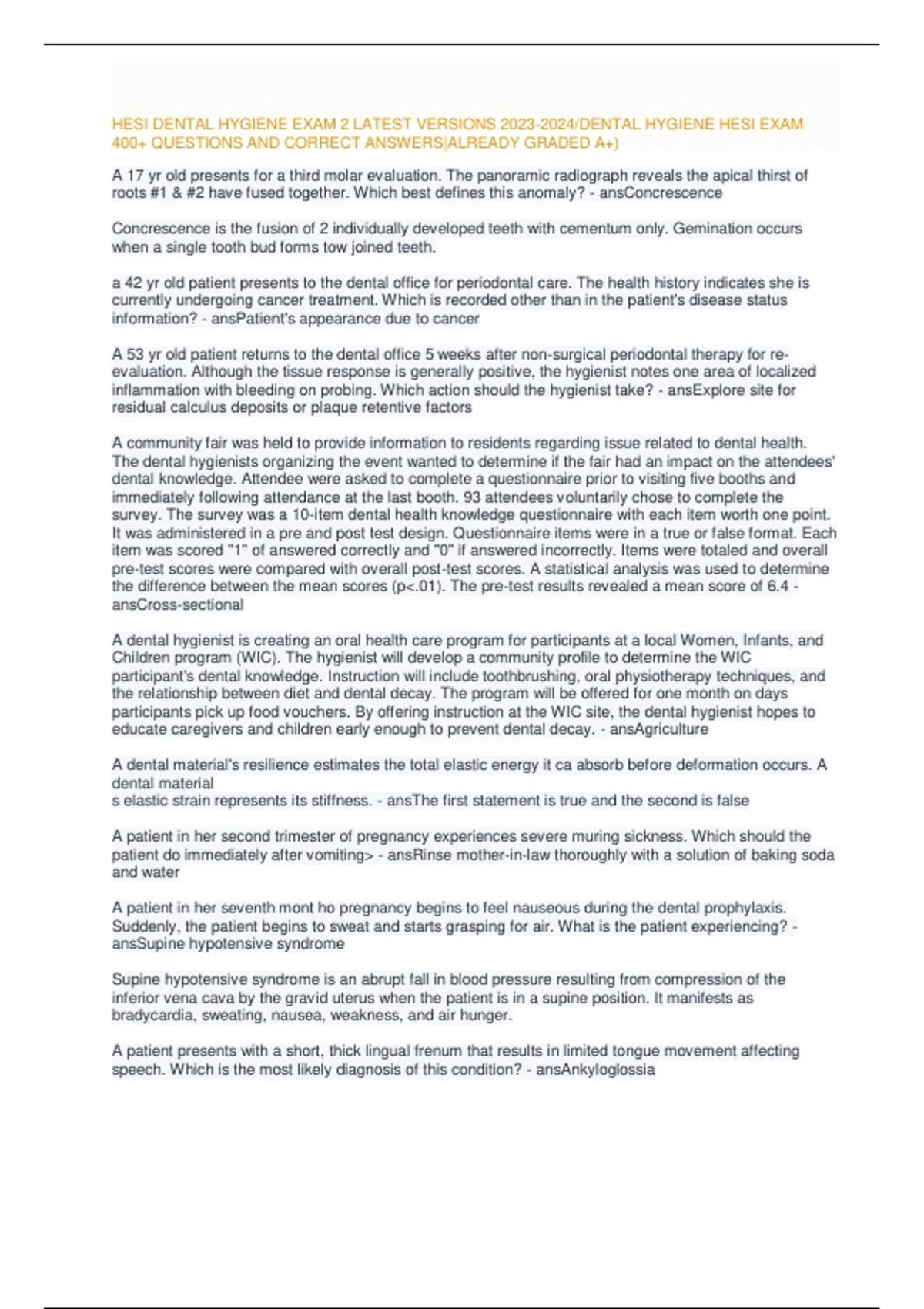 , HESI DENTAL HYGIENE EXAM 2 LATEST VERSIONS 2023-2024/DENTAL HYGIENE HESI EXAM