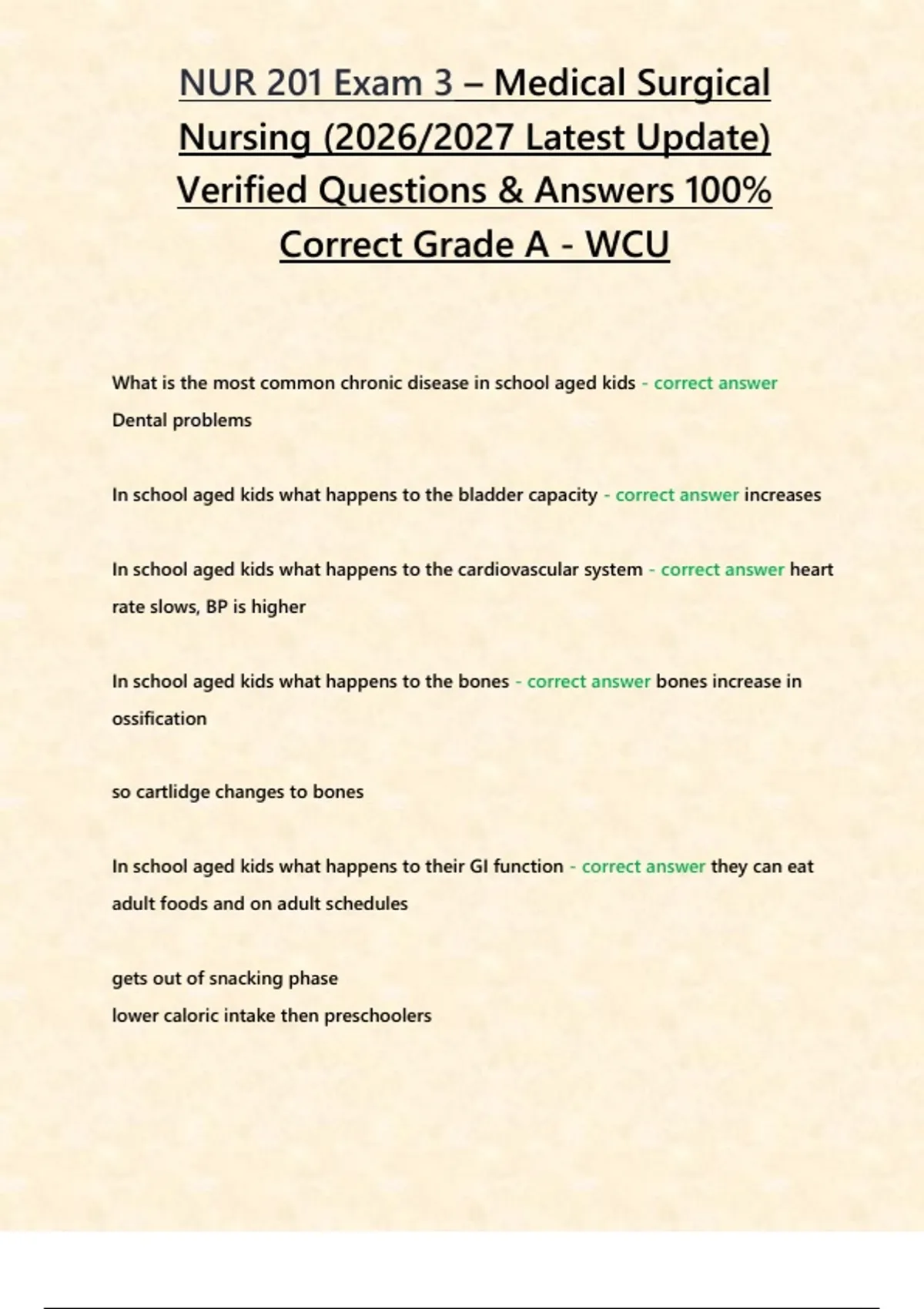 NUR 201 Exam 3 – Medical Surgical Nursing (2026/2027 Latest Update) Verified Questions & Answers 100% Correct Grade A - WCU What is the most common chronic disease in school aged kids - correct answer Dental problems In school aged kids what happens to the bladder capacity - correct answer increases In school aged kids what happens to the cardiovascular system - correct answer heart rate slows, BP is higher In school aged kids what happens to the bones - correct answer bones increase in ossification so cartlidge changes to bones In school aged kids what happens to their GI function - correct answer they can eat adult foods and on adult schedules