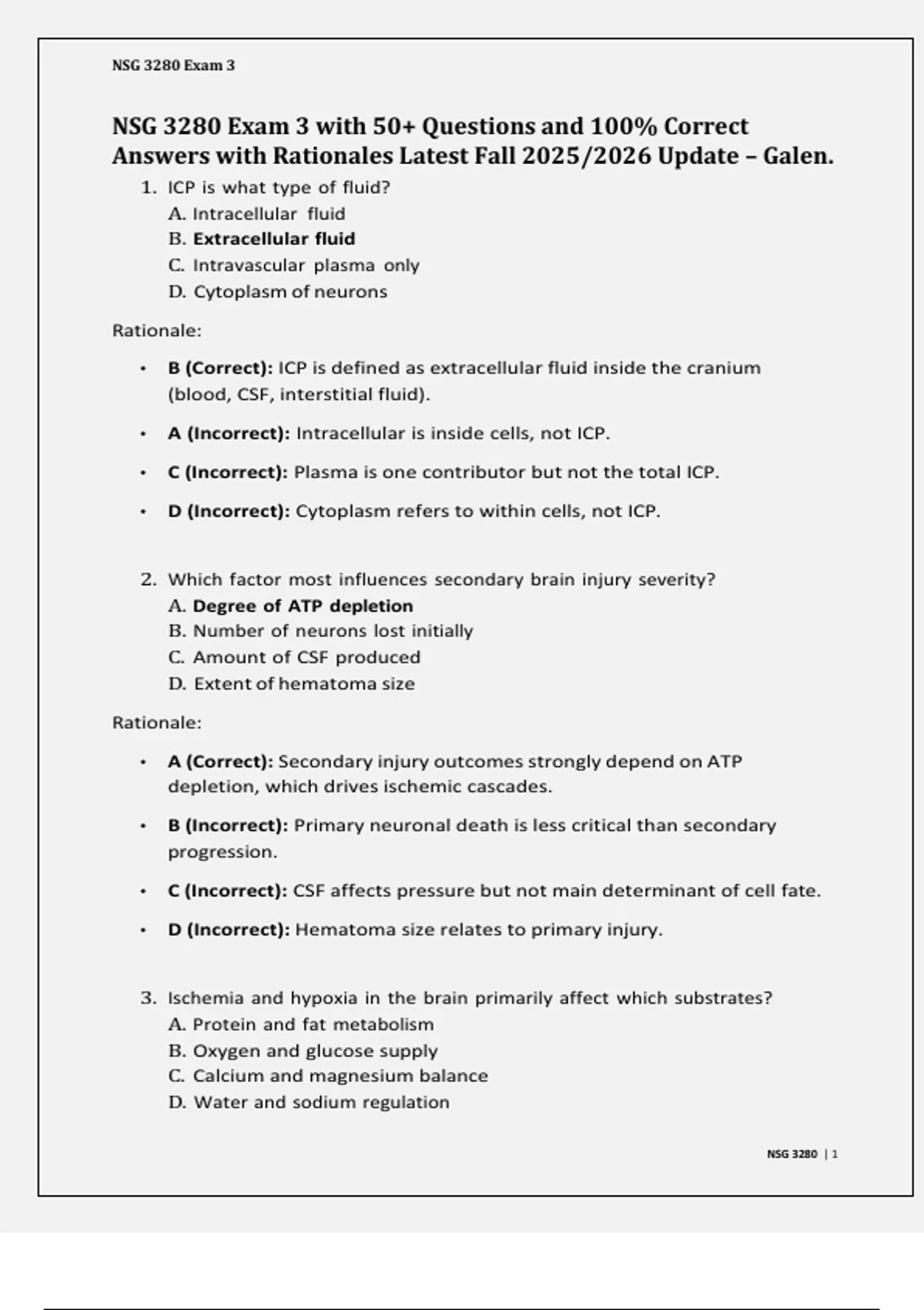 NSG 3280 Exam 3 with 50+ Questions and 100% Correct Answers with Rationales Latest Fall 2025/2026 Update – Galen.