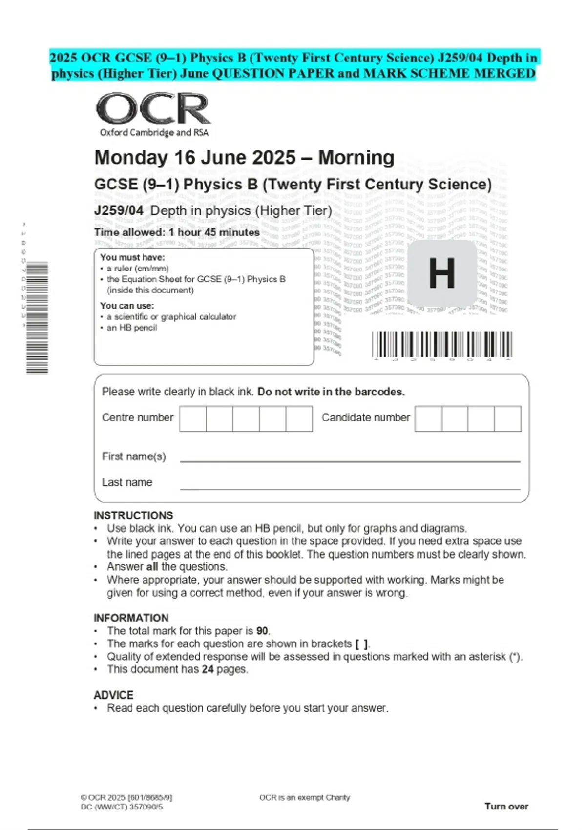 2025 OCR GCSE (9-1) Physics B (Twenty First Century Science) J259/04 Depth in physics (Higher Tier) June QUESTION PAPER and MARK SCHEME MERGED