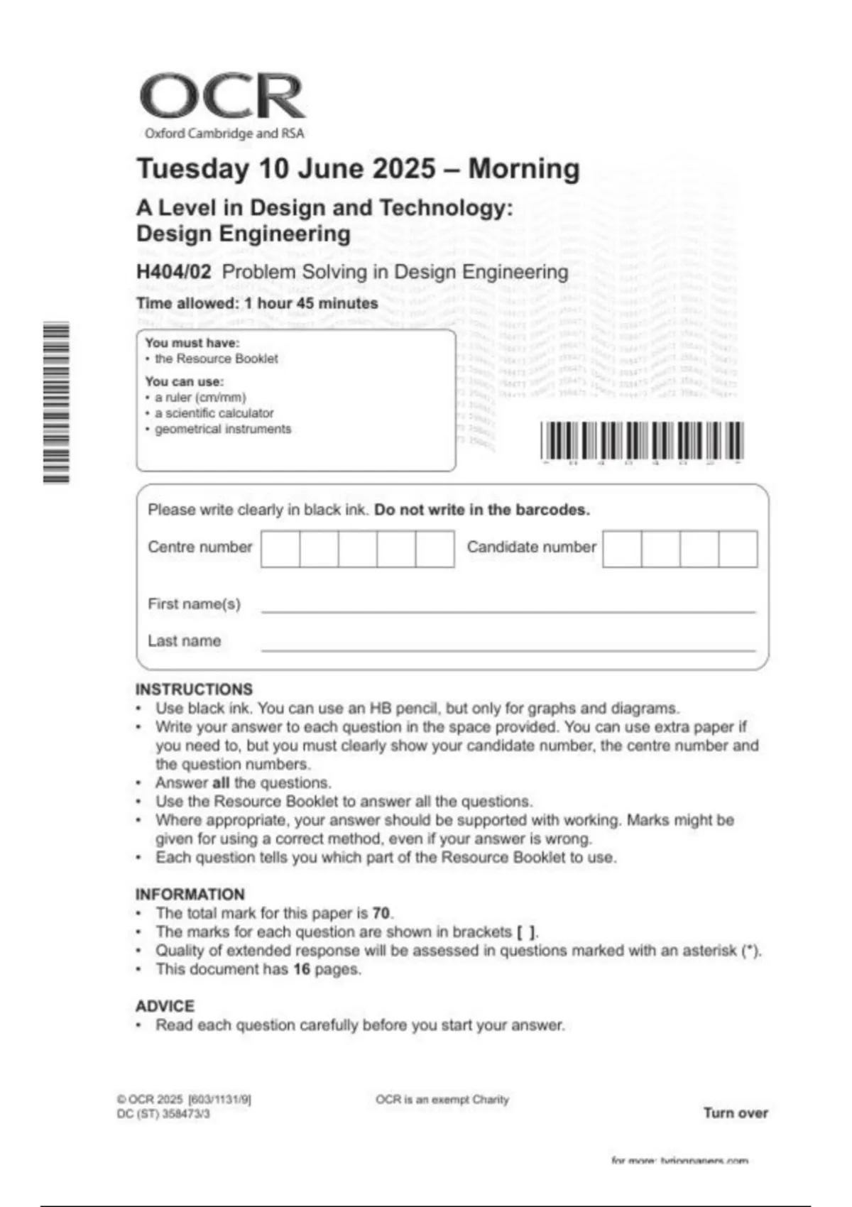 OCR A Level Design and Technology; Design Engineering paper 2| H404_02| June 2025 Question paper