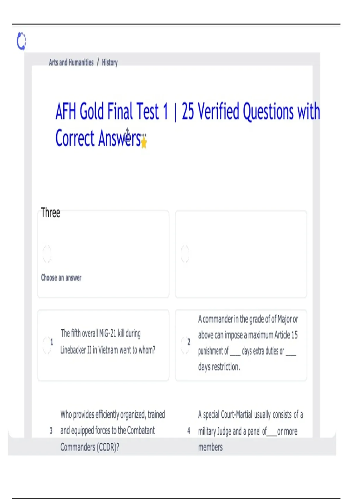 This set covers all 25 questions from AFH Gold Final Test 1 with fully verified correct answers. It provides a quick and reliable review to help you master the tested concepts and prepare with confidence.