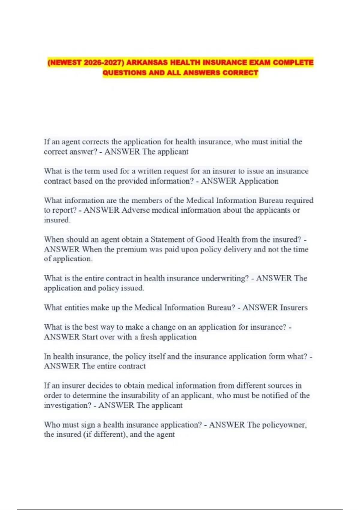 (NEWEST ) ARKANSAS HEALTH INSURANCE EXAM COMPLETE QUESTIONS AND ALL ANSWERS CORRECT