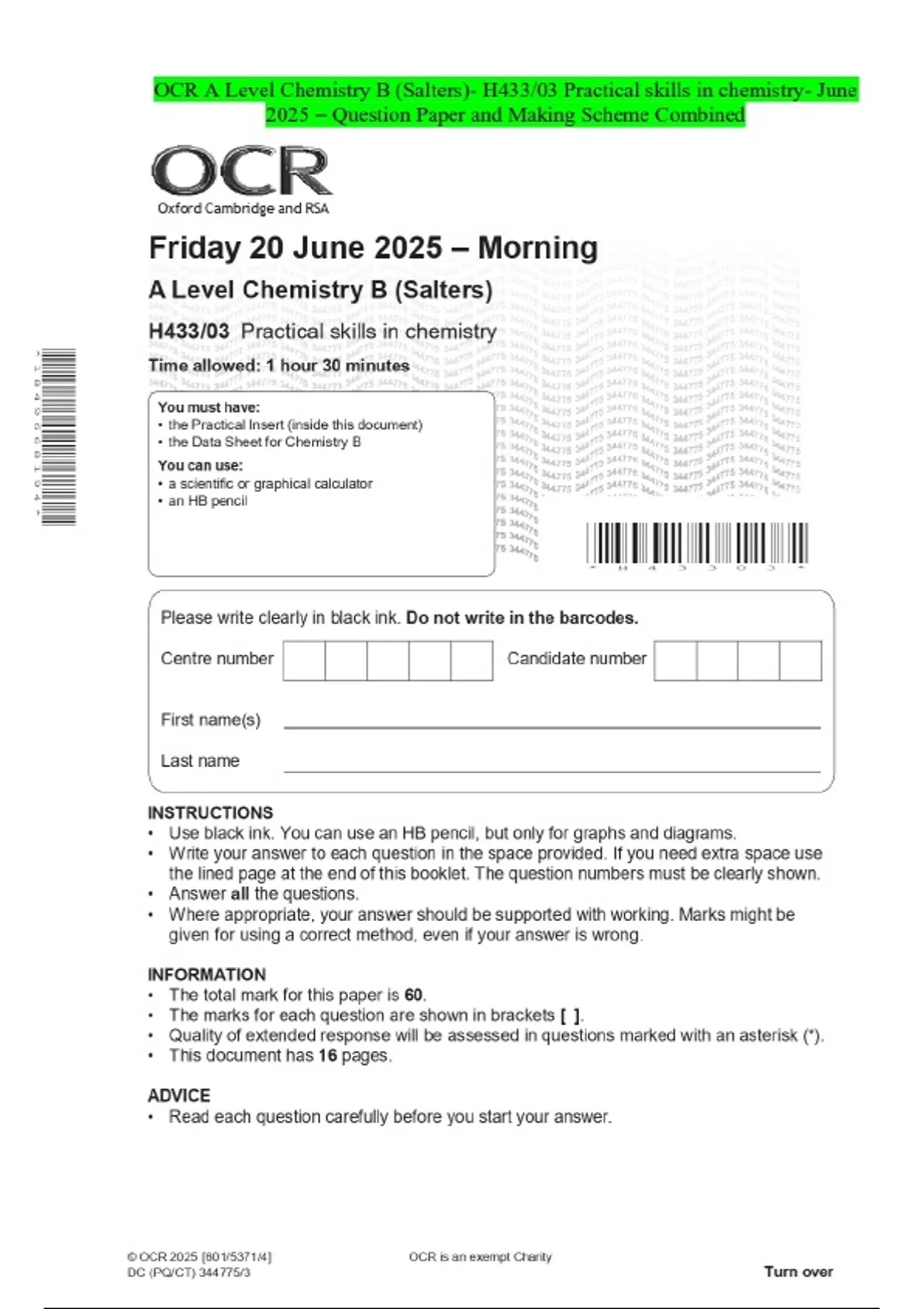 OCR A Level Chemistry B (Salters)- H433/03 Practical skills in chemistry- June 2025 - Question Paper and Making Scheme Combined