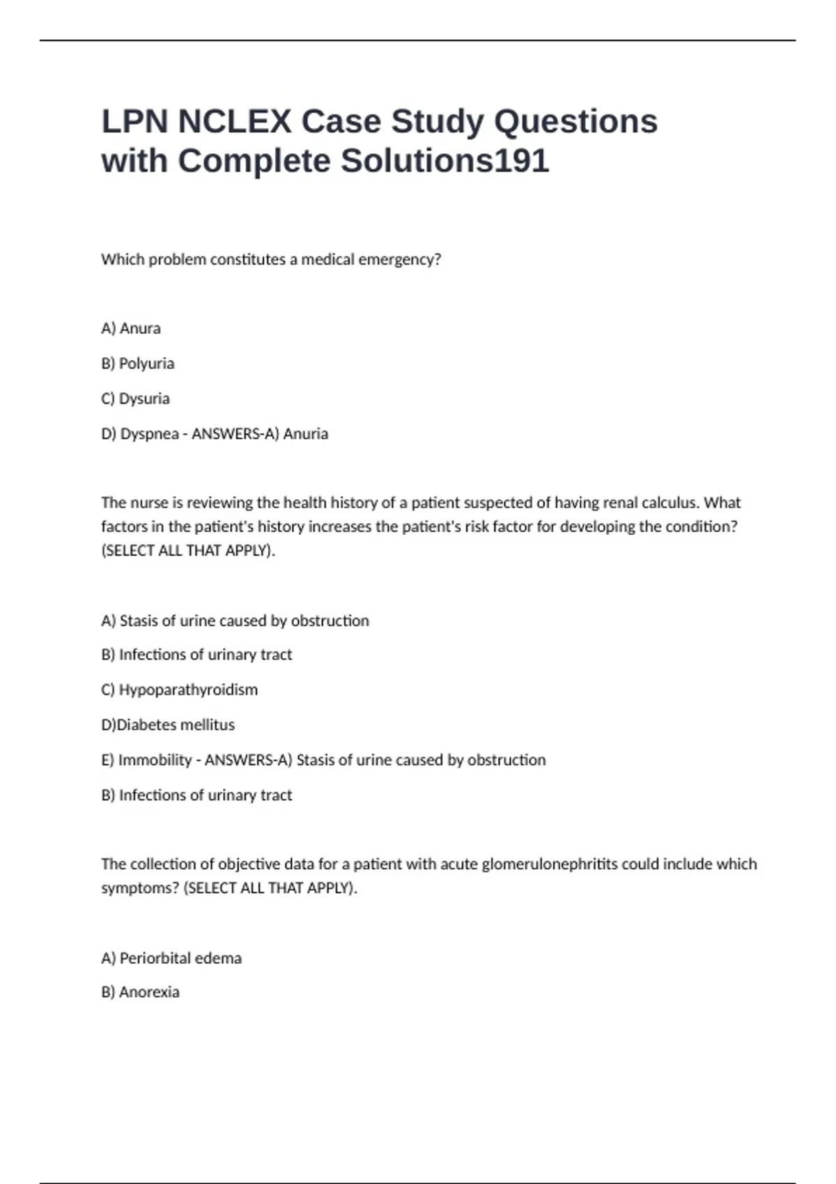 LPN NCLEX Case Study Questions with Complete Solutions Which problem constitutes a medical emergency? A) Anura B) Polyuria C) Dysuria D) Dyspnea - ANSWERS-A) Anuria The nurse is reviewing the health history of a patient suspected of having renal calculus. What factors in the patient's history increases the patient's risk factor for developing the condition? (SELECT ALL THAT APPLY). A) Stasis of urine caused by obstruction B) Infections of urinary tract C) Hypoparathyroidism D)Diabetes mellitus E) Immobility - ANSWERS-A) Stasis of urine caused by obstruction B) Infections of urinary tract The collection of objective data for a patient with acute glomerulonephritits could include which symptoms? (SELECT ALL THAT APPLY). A) Periorbital edema B) Anorexia