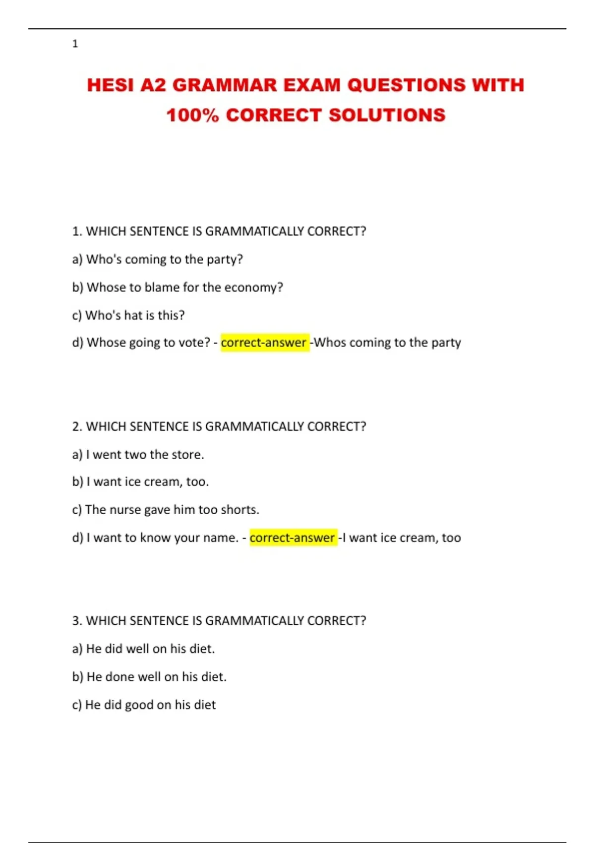 HESI A2 GRAMMAR EXAM QUESTIONS WITH
