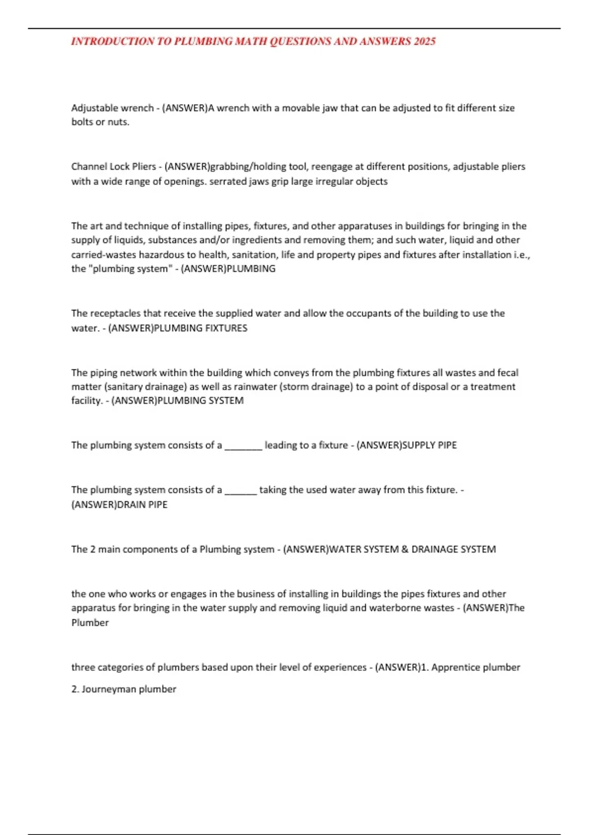 INTRODUCTION TO PLUMBING MATH QUESTIONS AND ANSWERS 2025