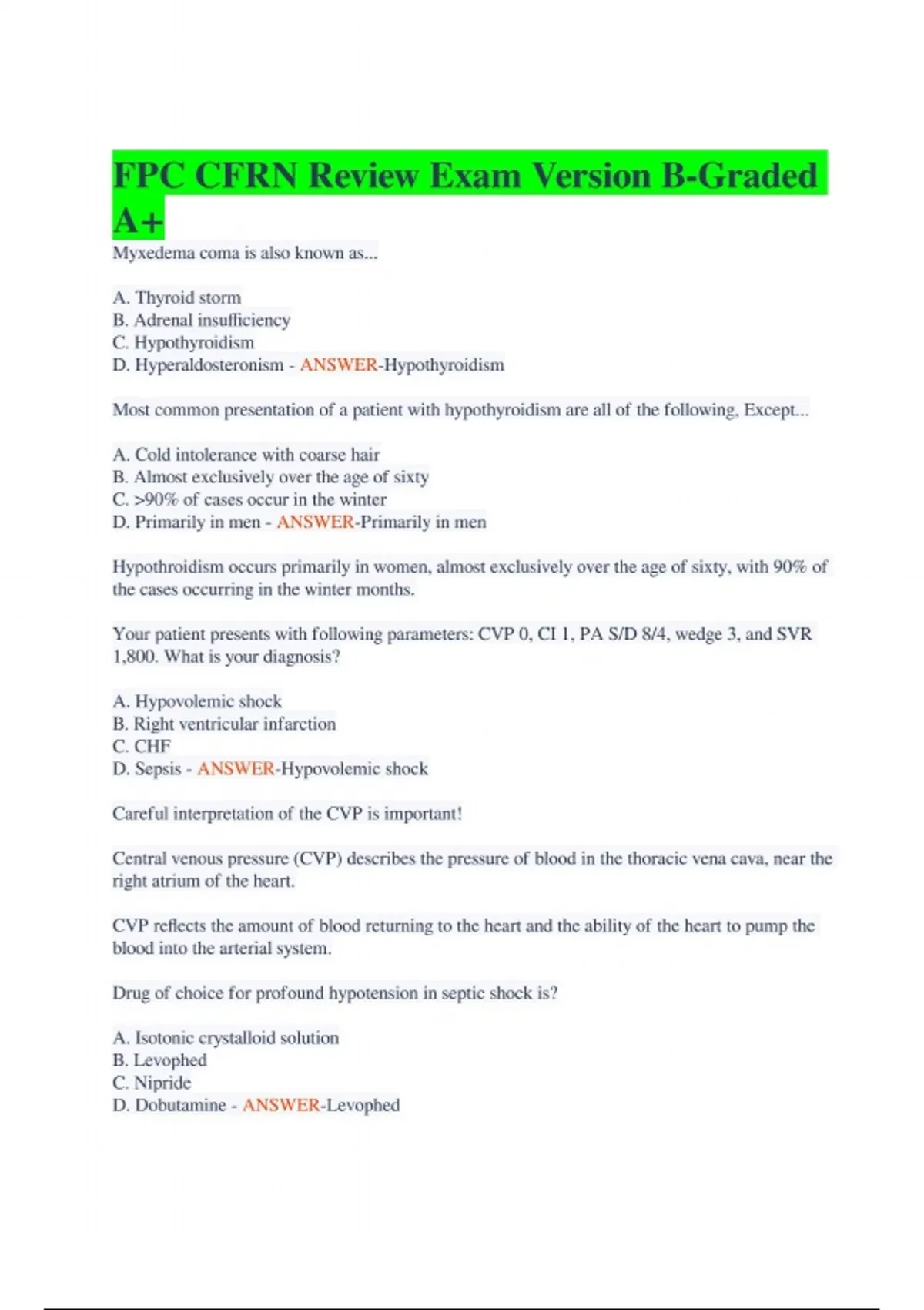 Fully updated FPC & CFRN Review Exam Version B with verified A+ answers. Includes high-yield critical care transport content, flight physiology, airway/vent management, trauma, cardiology, pharmacology, lab/diagnostic interpretation, and scenario-based reasoning for top exam performance.