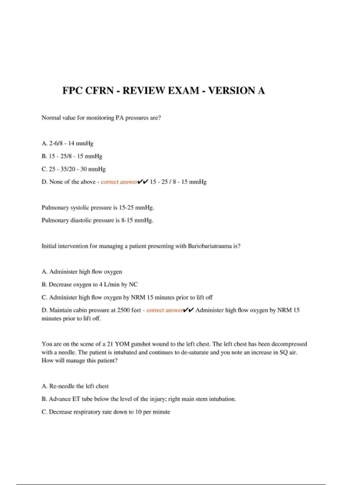Complete and updated FPC & CFRN Review Exam – Version A with verified, high-accuracy answers. Includes critical care transport, flight physiology, airway and ventilator management, trauma, cardiology, pharmacology, and advanced diagnostic reasoning content to support top-score exam preparation.