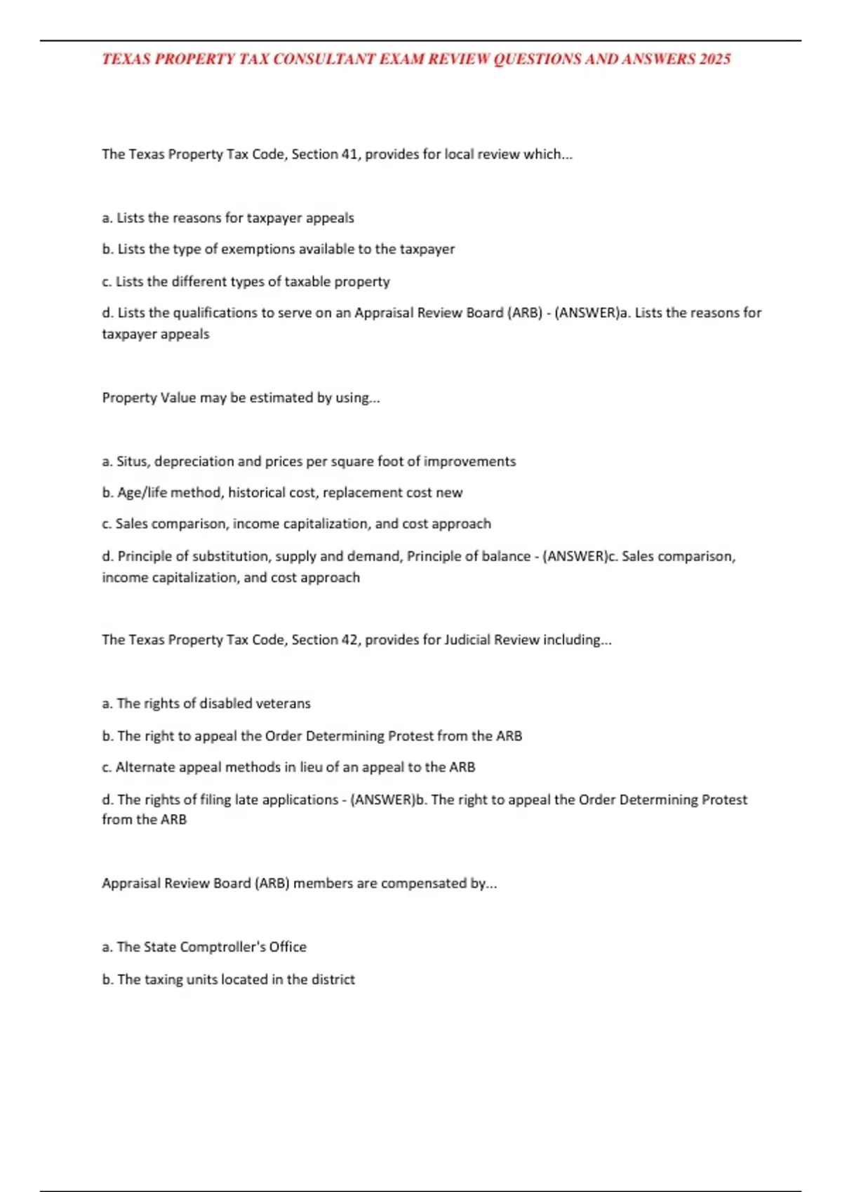 ,TEXAS PROPERTY TAX CONSULTANT EXAM REVIEW QUESTIONS AND ANSWERS 2025