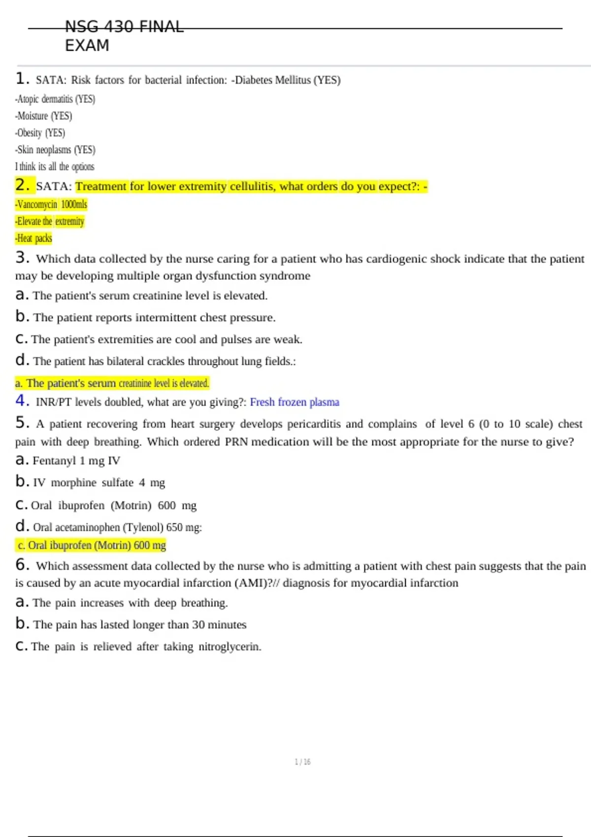 1. SATA: Risk factors for bacterial infection: -Diabetes Mellitus (YES)
