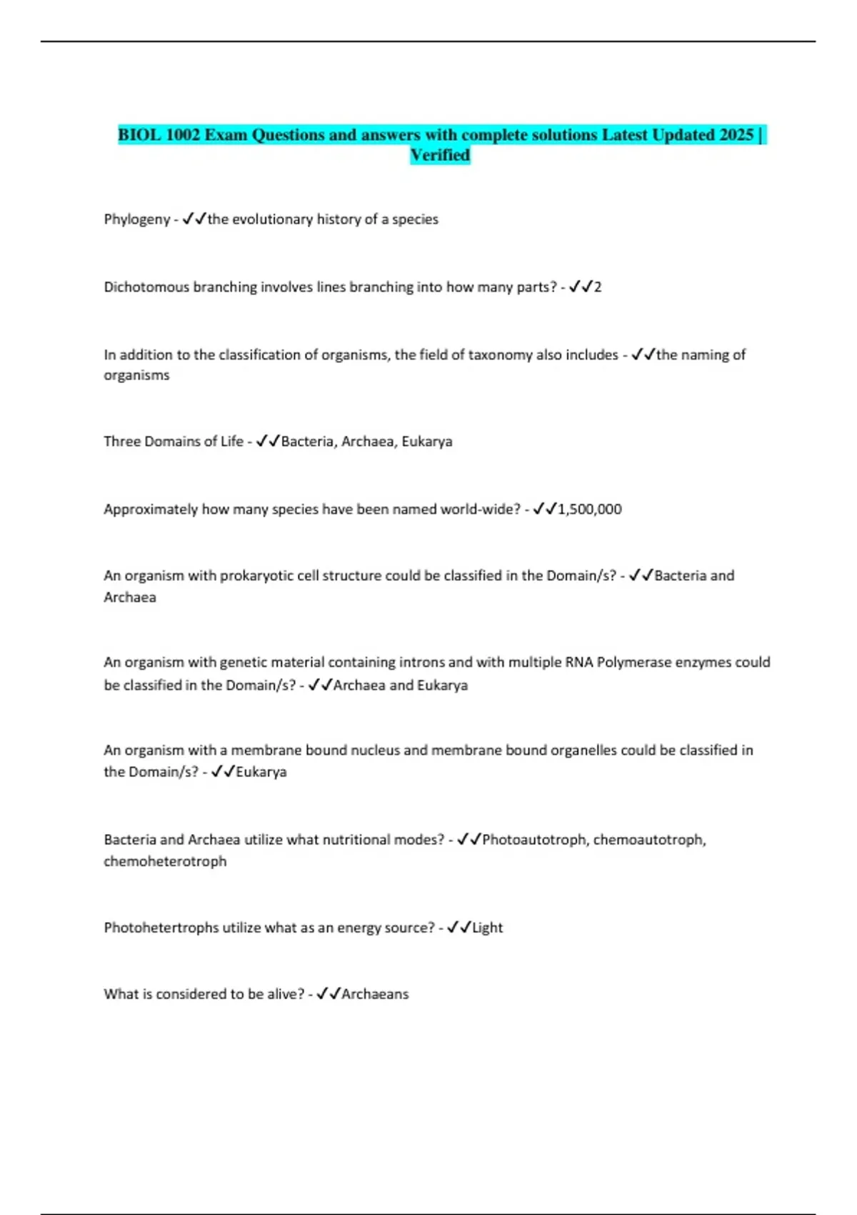 BIOL 1002 Exam Questions and answers with complete solutions Latest Updated 2025 |