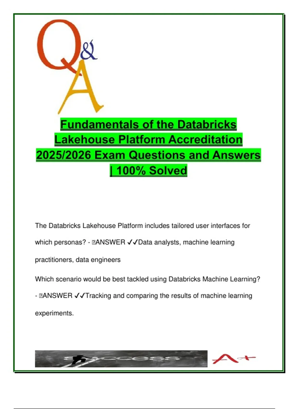 This document contains over 60 fully solved and up-to-date exam questions and answers for the Fundamentals of the Databricks Lakehouse Platform Accreditation (2025/2026). It serves as a comprehensive and focused exam preparation resource for professionals and students seeking foundational knowledge of the Databricks Lakehouse architecture. Key topics include Delta Lake functionality, Unity Catalog and access control, machine learning workflows using MLflow, ACID transactions, schema enforcement, data encryption, support for diverse data types, and the differences between Databricks SQL, Machine Learning, and Engineering interfaces. Additional emphasis is placed on open-source integrations like Apache Spark and Redash, as well as CI/CD workflows within Databricks Repos and Workflows. This material is highly relevant for: Data Analysts, Data Engineers, Machine Learning Practitioners Students enrolled in Data Engineering, Data Science, or Big Data Technology programs Professionals pursuing Databricks certifications Academic institutions and bootcamps offering cloud data platform training Whether preparing for certification or aiming to strengthen foundational knowledge, this document provides reliable coverage of the Databricks ecosystem with real exam-based content. Keywords: Databricks Lakehouse, Delta Lake, MLflow, Apache Spark, Databricks SQL, Unity Catalog, ACID transactions, schema enforcement, CI/CD, Databricks Repos, open source, data governance, machine learning, data engineering, Databricks exam 2025